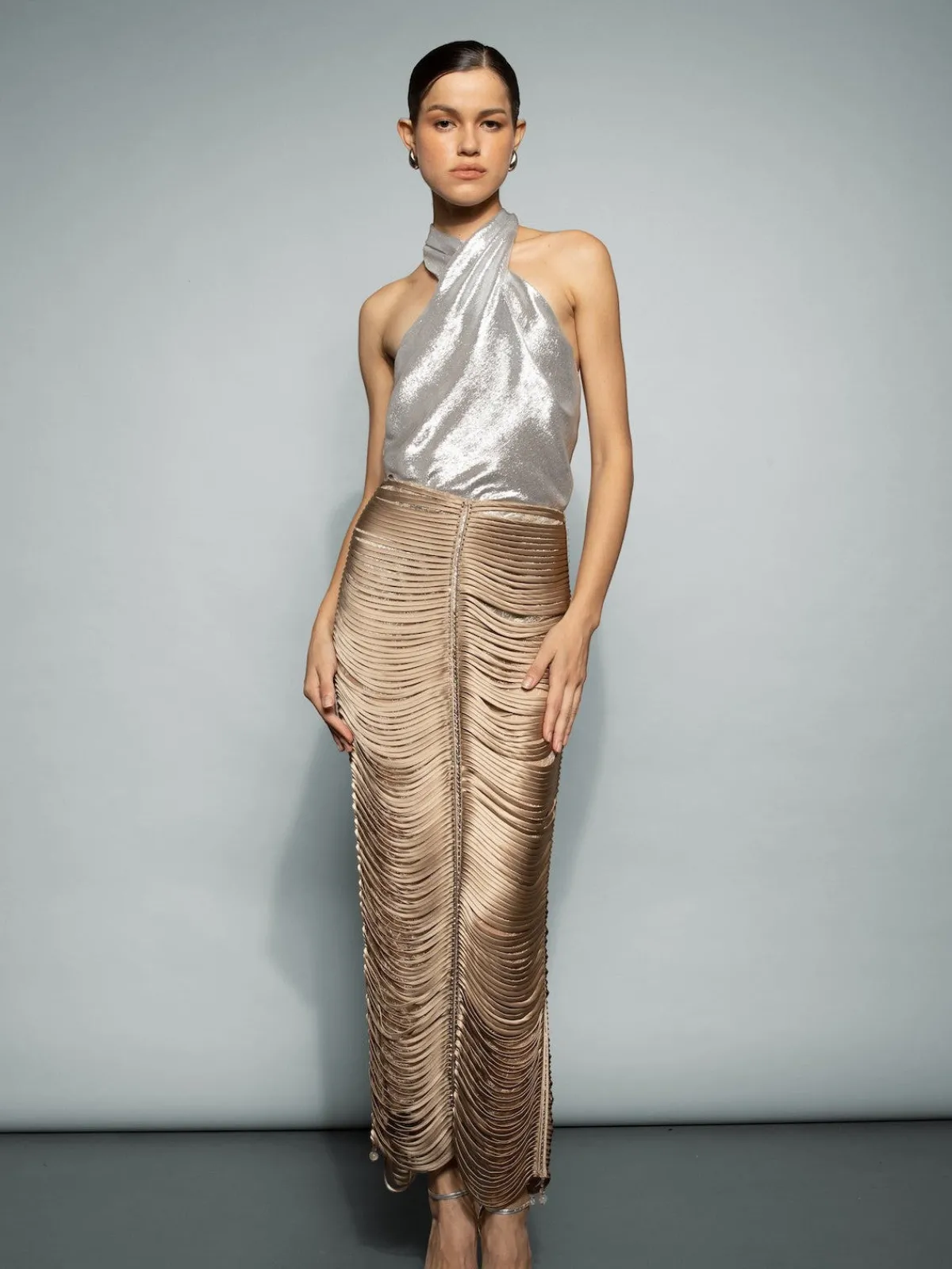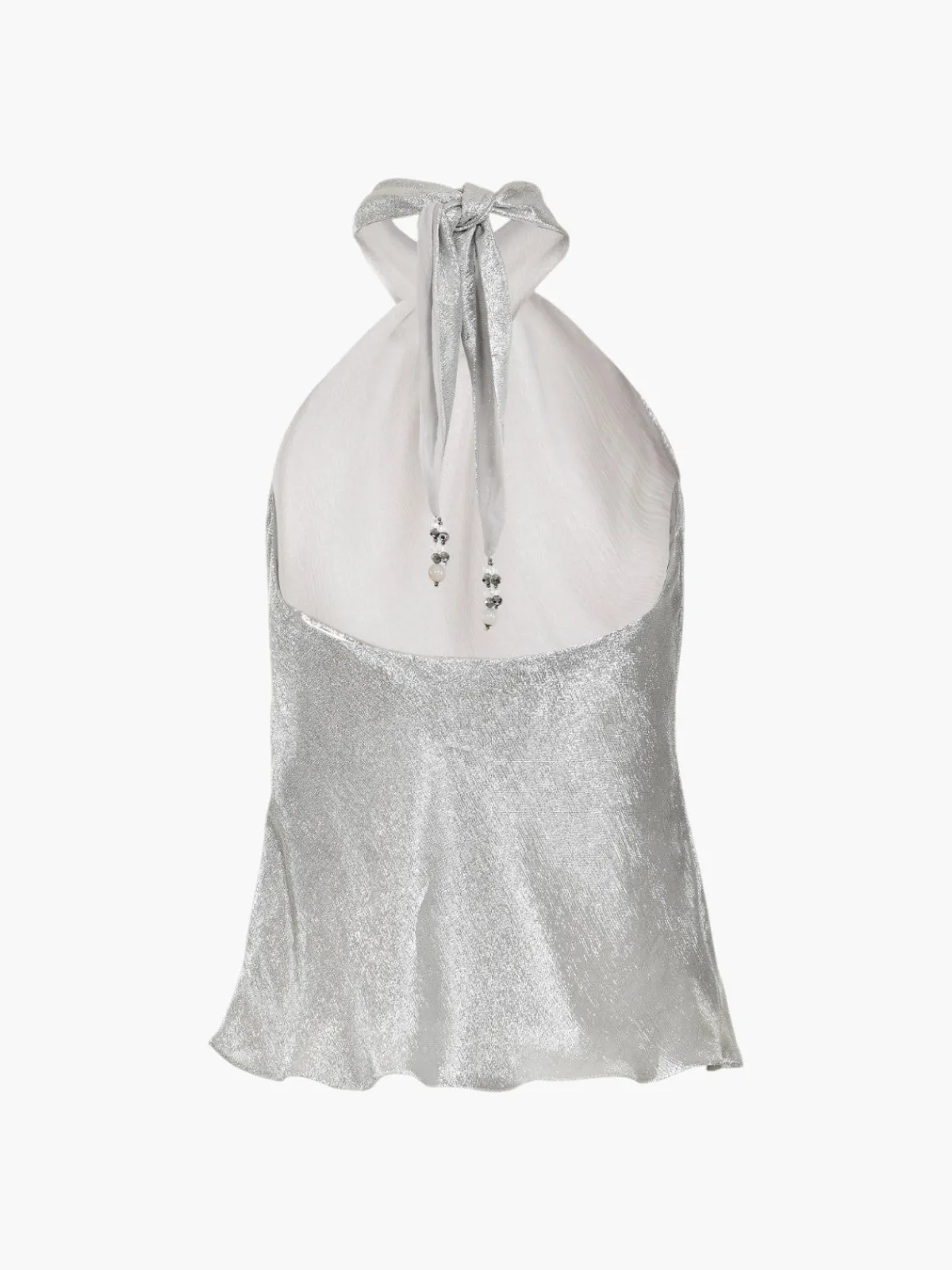 Our Francesca Miranda Olivia Lurex Top is a halter style top that crosses in the front and ties in the back. Handcrafted by female heads of households in Colombia.