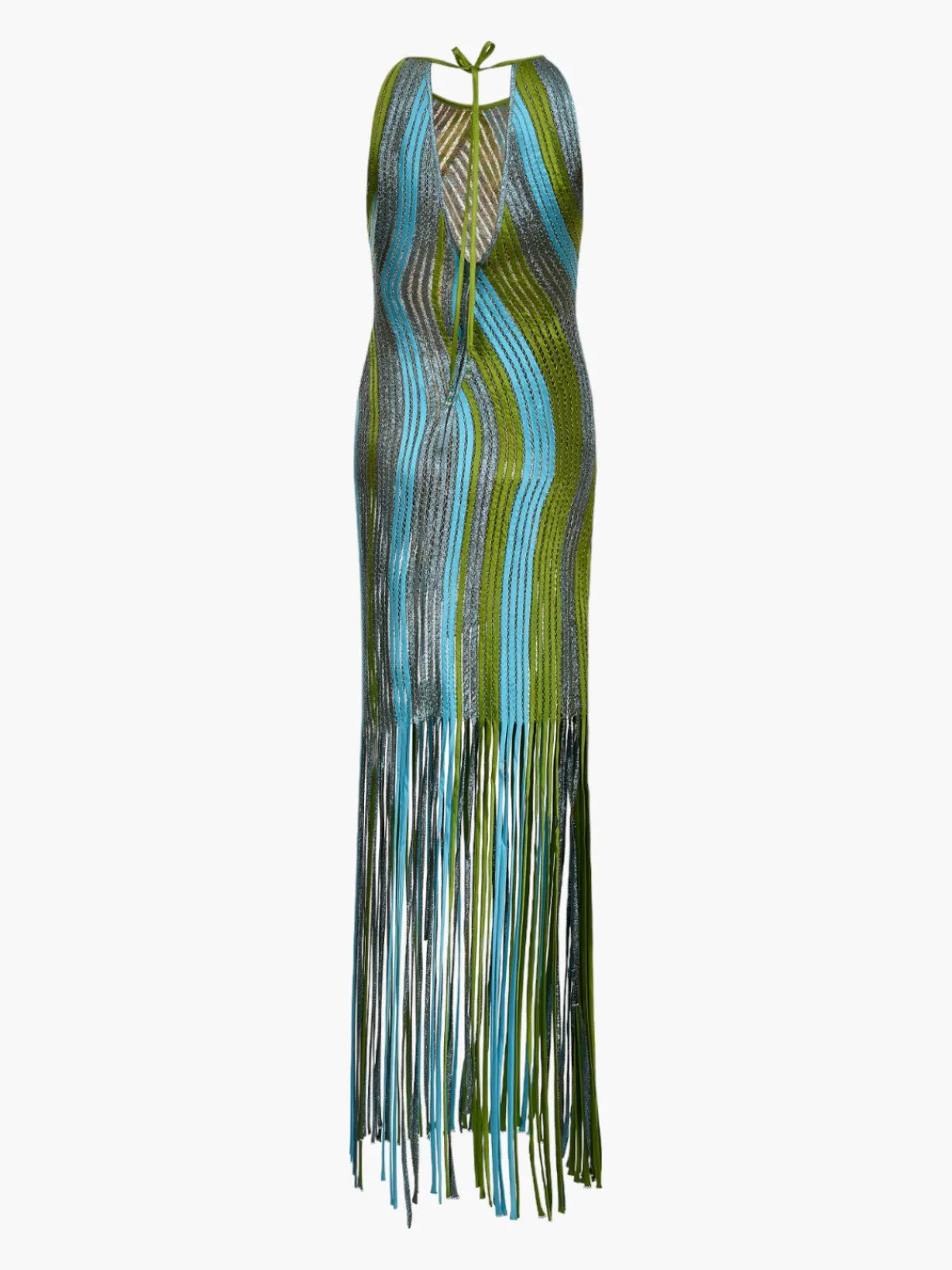 Our Francesca Miranda Pere Dress is a midi length dress featuring silk, metallic fringe details at the bottom of the dress. The dress is a halter neckline that ties behind the neck.Handcrafted by female heads of households in Colombia.