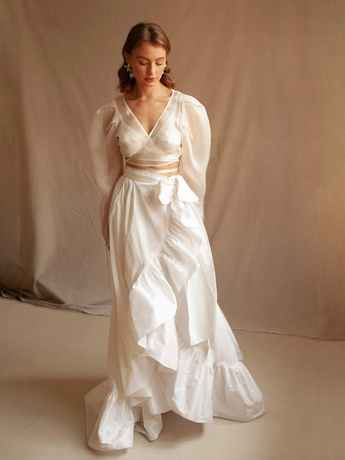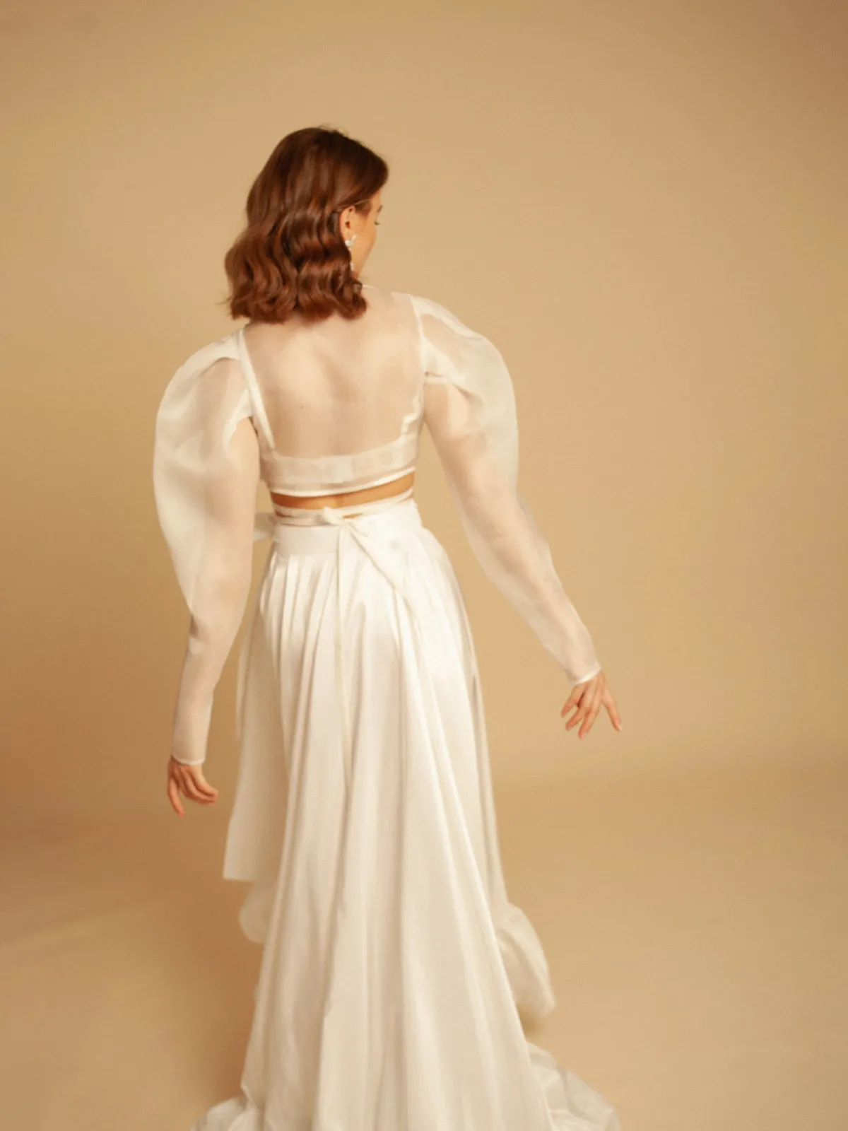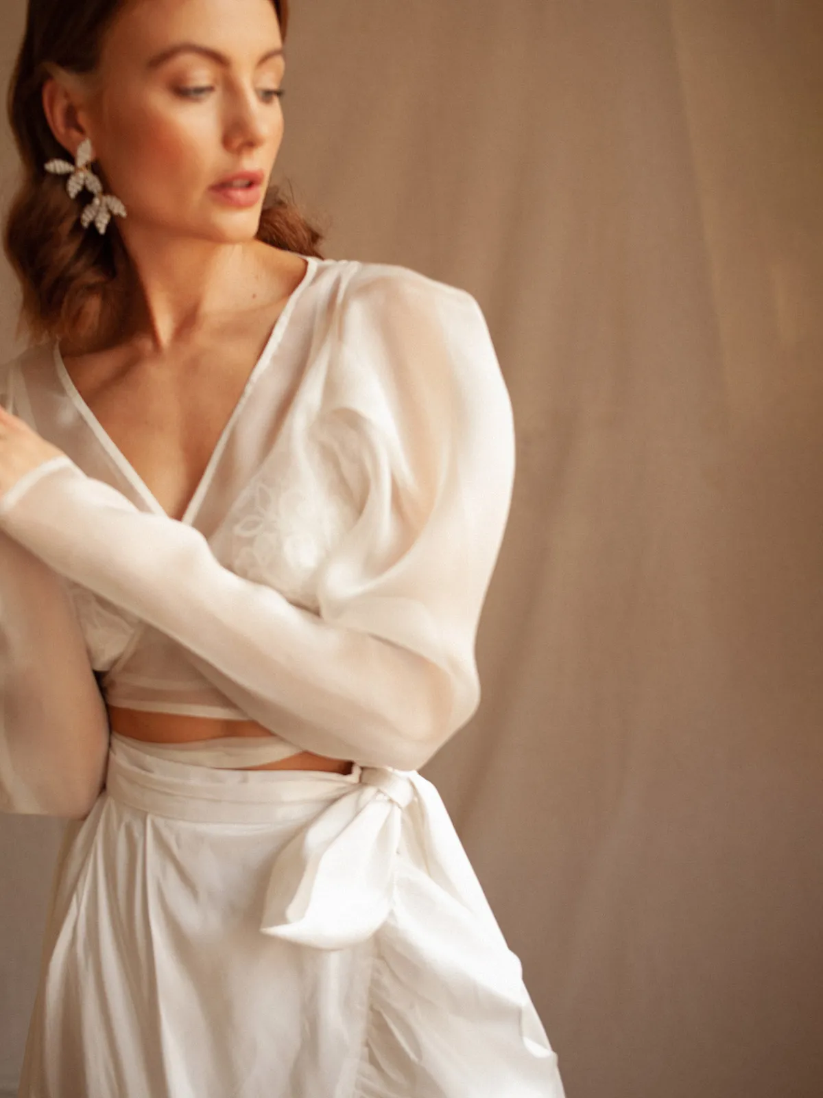 Our Francesca Miranda Pilar Blouse features a cropped wrap silhouette with long puffed sleeves, a V-neckline, and a button closure in back. Handcrafted in Colombia by female heads of households.