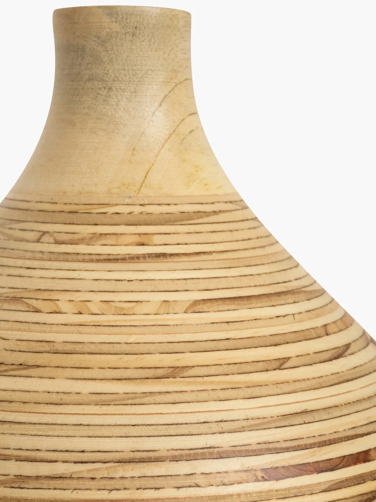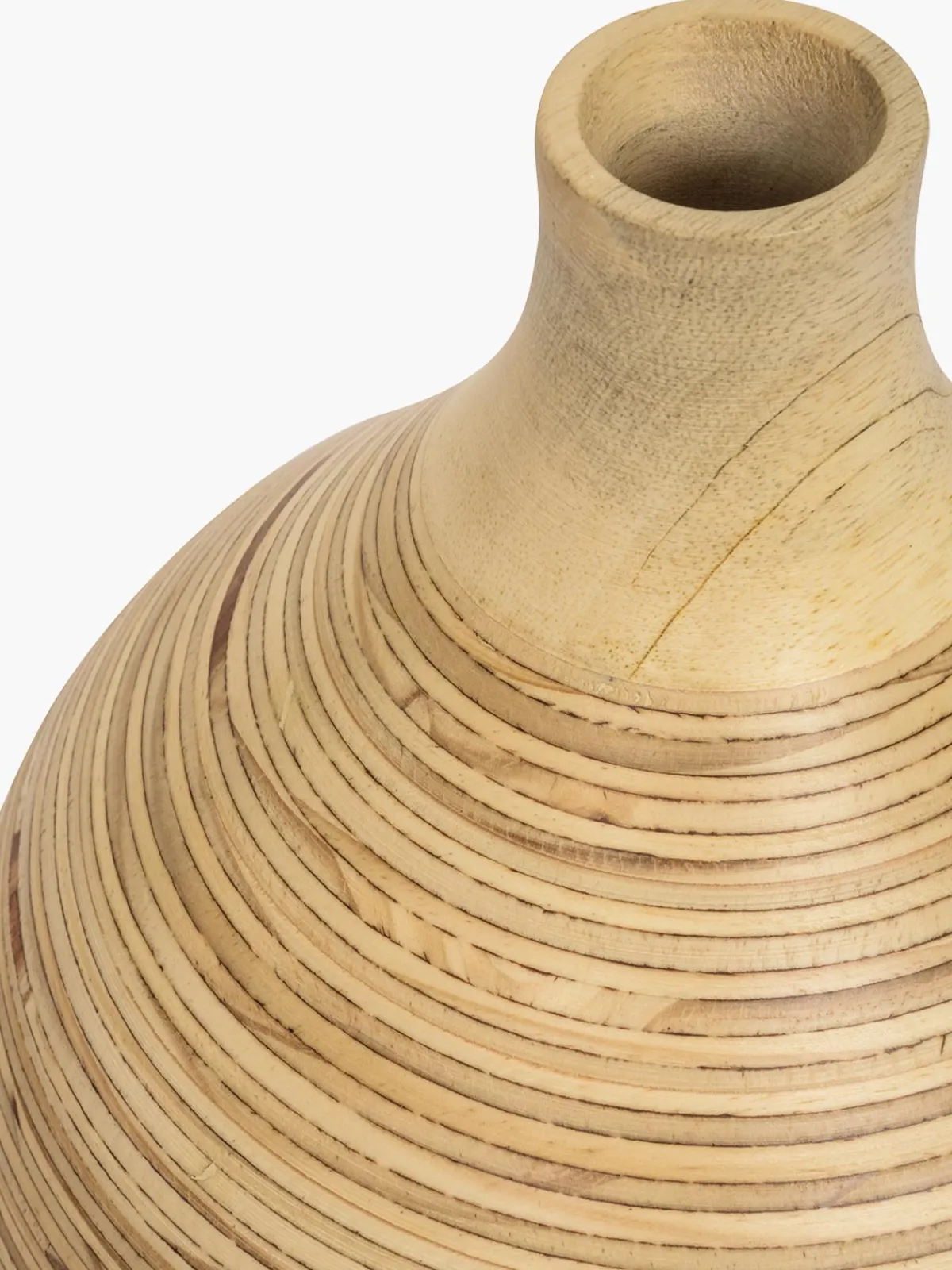 Our Francesca Miranda Sindamanoy Vase catches the eye in layers of wood sculpted into a thick round body with a slender, tapered neck. Handcrafted by artisans in Colombia.