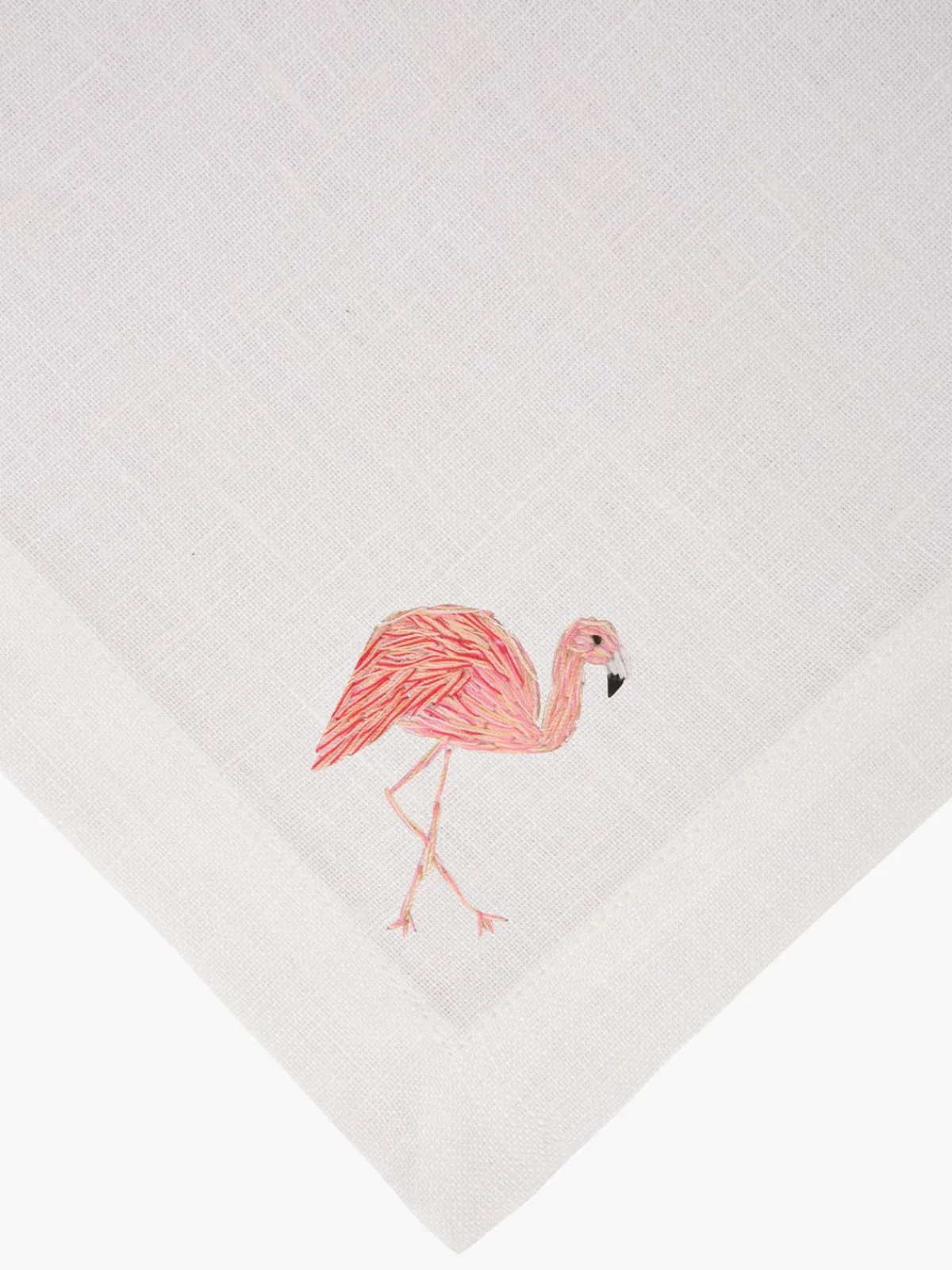 Our Francesca Miranda Table Napkins Set of 4 inFlamingo includes four matching napkins, each of which is hand-embroidered with a distinctive graphic in the corner. Handcrafted by artisans in Colombia.