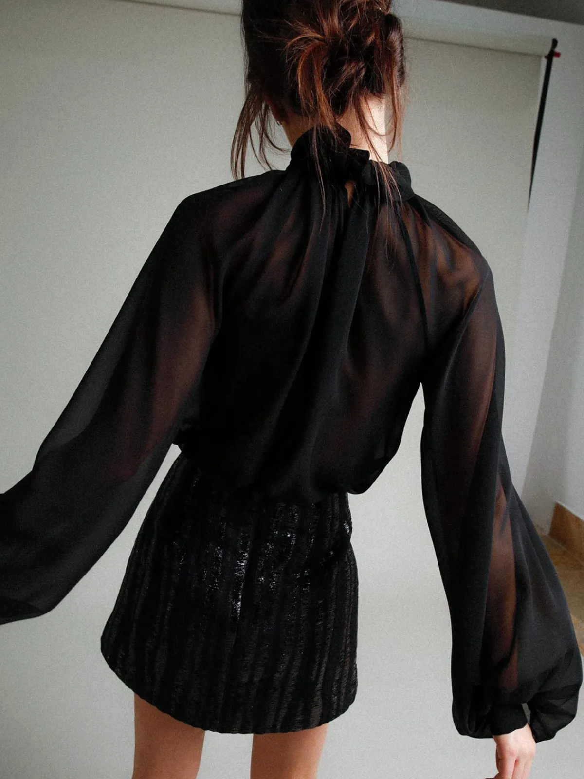 Our Francesca Miranda Tortuga Silk Top in Black is a sheer blouse with a ruffled high neckline and cinched sleeves at the wrist.Handcrafted by female heads of households in Colombia.