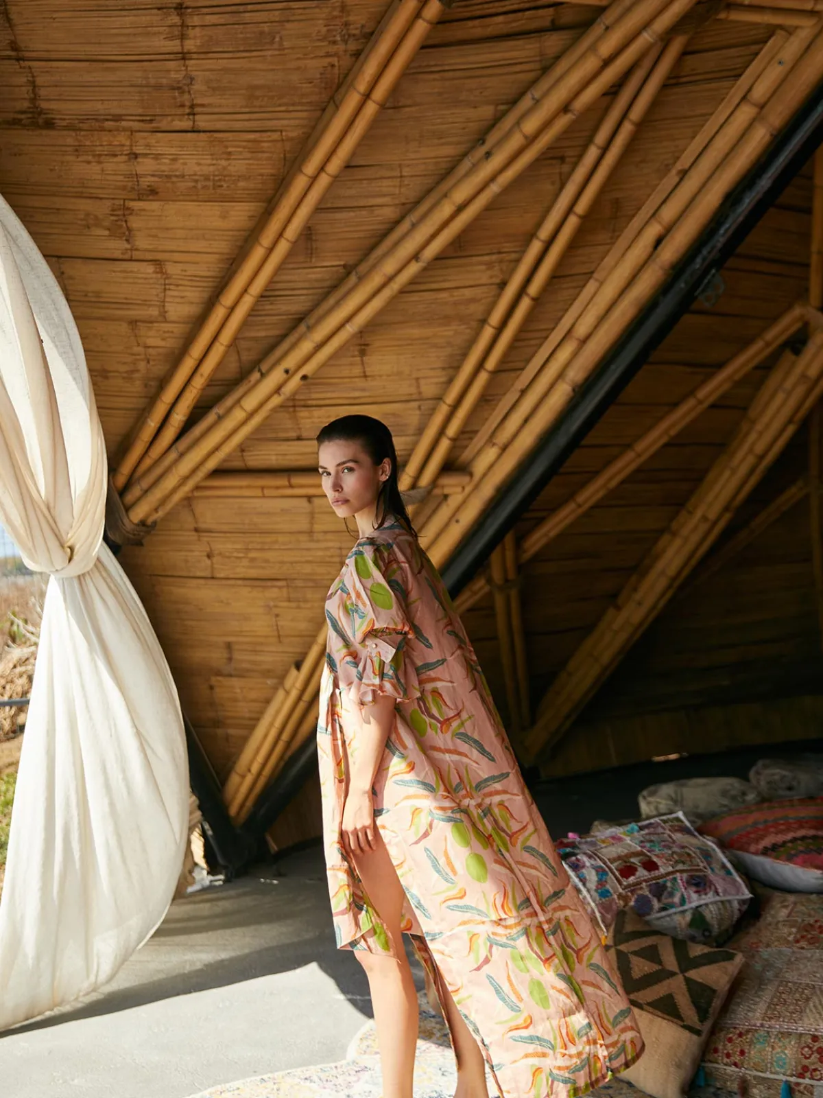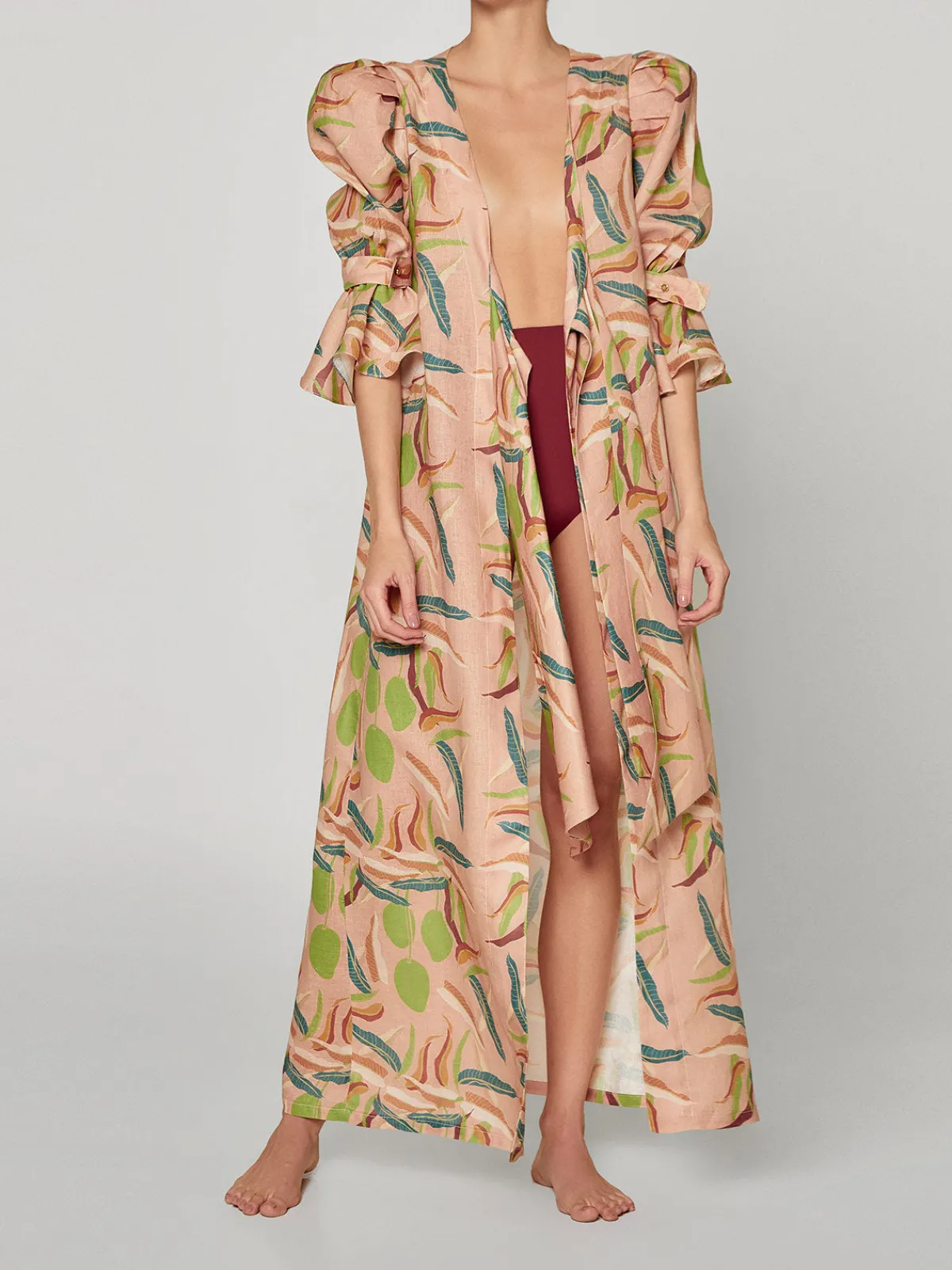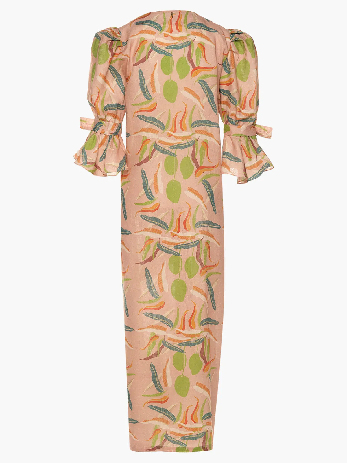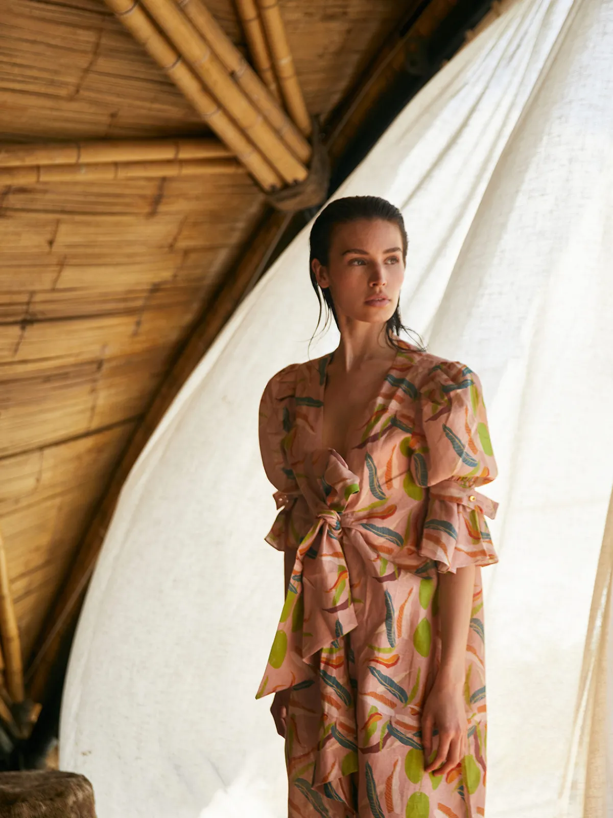 Our Juan de Dios Agua Alta Linen Dress in Rose Mangos boasts a flowy silhouette in a maxi length with puffed shoulders, 3/4 length sleeves, and an open front with a tie closure. Crafted by artisans in Colombia.
