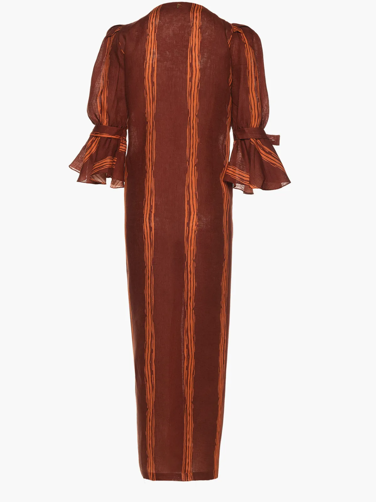 Our Juan de Dios Agua Alta Linen Dress in Wine Stripes boasts a flowy silhouette in a maxi length with puffed shoulders, 3/4 length sleeves, and an open front with a tie closure. Crafted by artisans in Colombia.