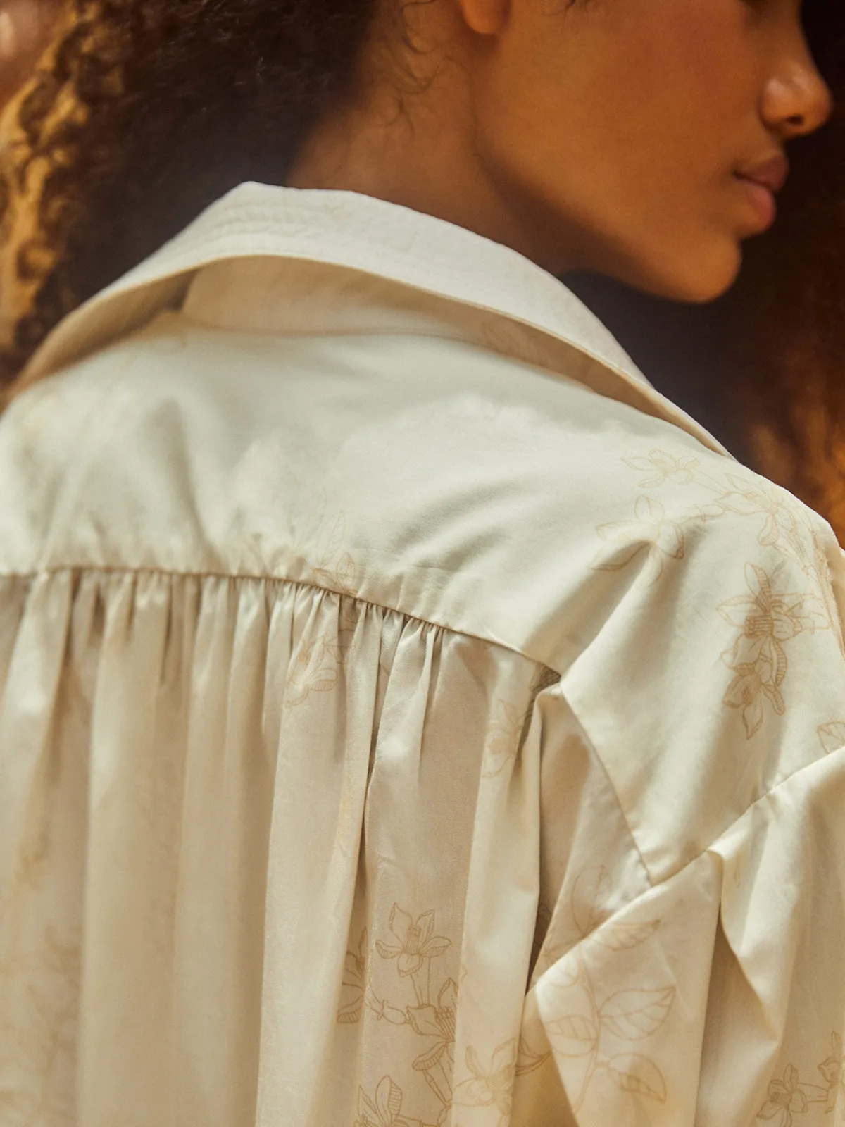 Our Juan de Dios Barnes Cotton Shirt in Ivory features a relaxed silhouette with long blouson sleeves, a collar, and a button front placket. Wear it long or knot it at the waist. Handcrafted in Colombia by female heads of households.