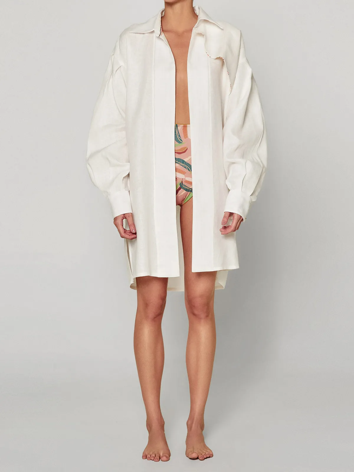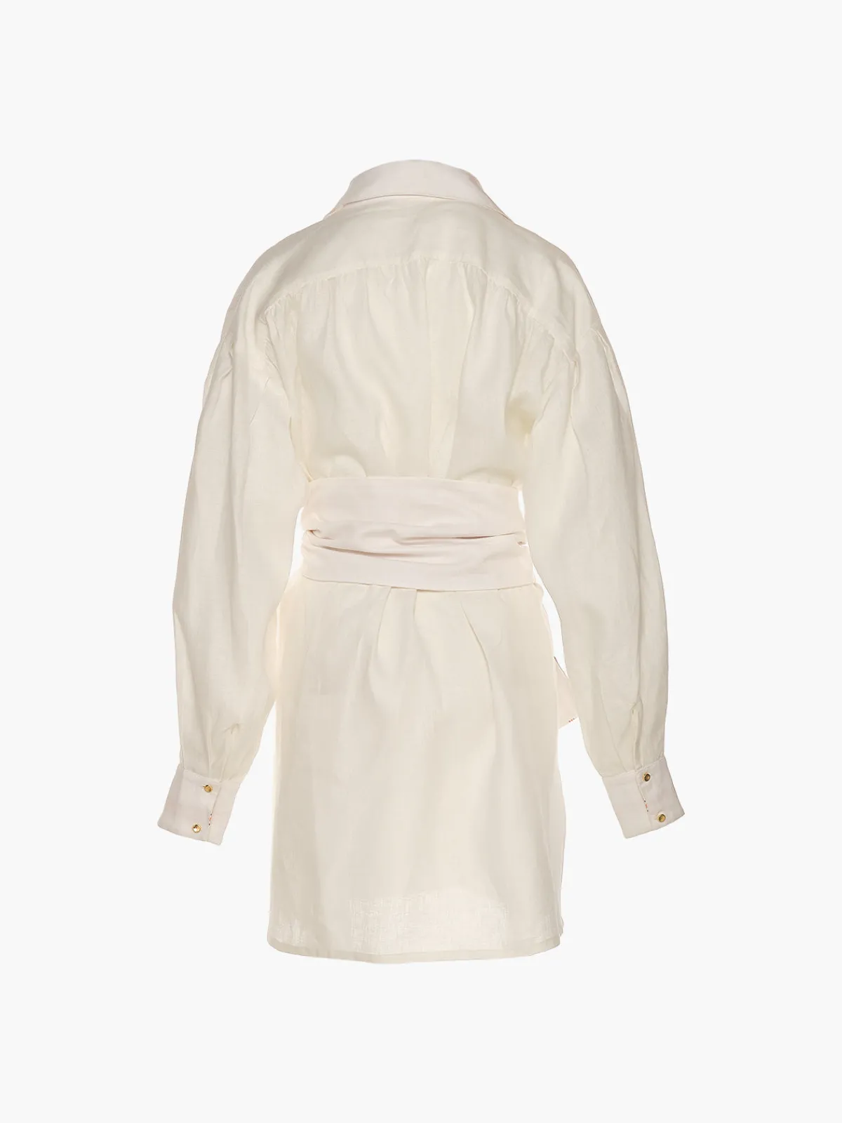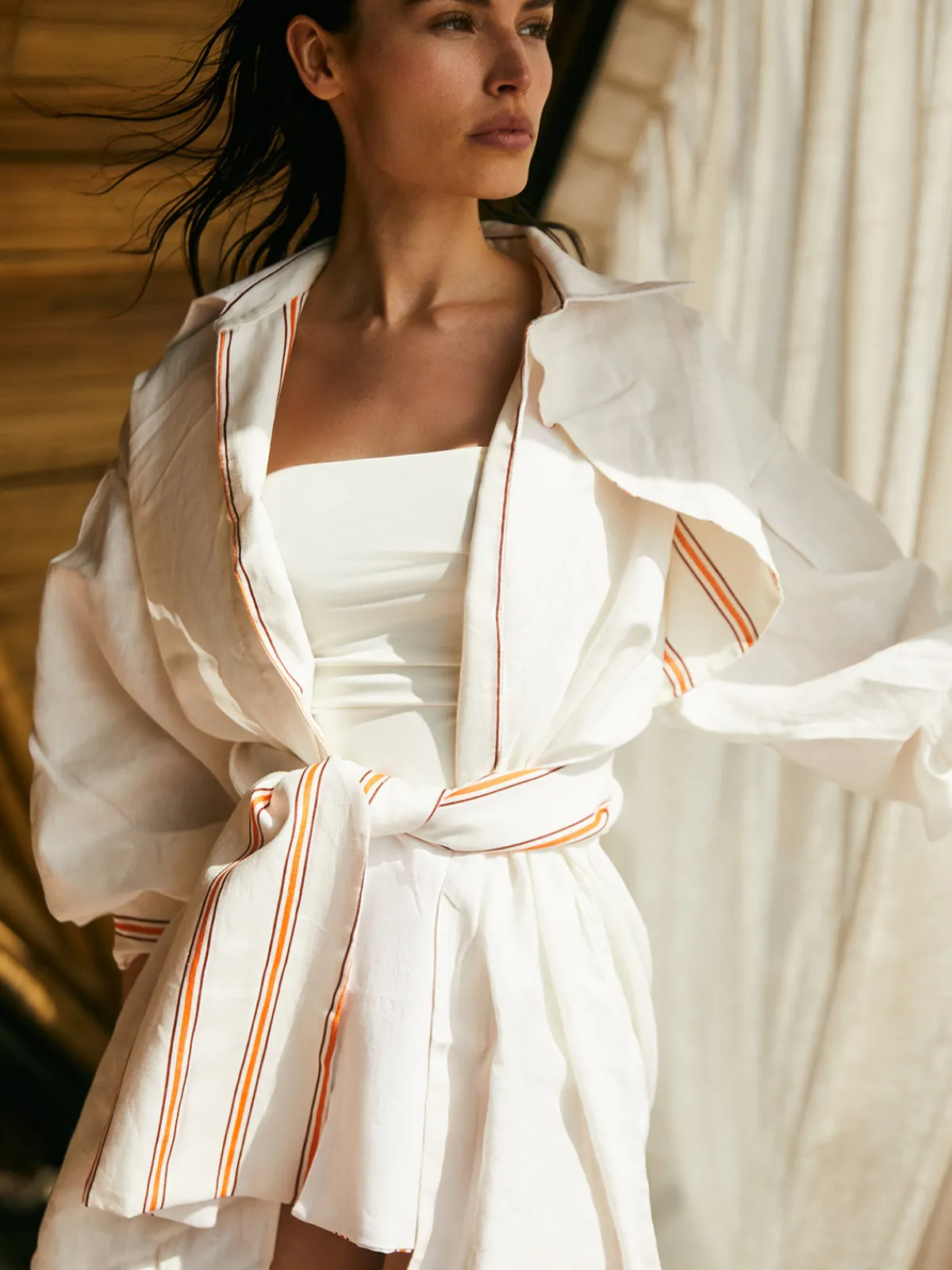 Our Juan de Dios Barnes Linen Shirt features a relaxed fit in a pullover silhouette with long sleeves, a V-neckline, and side slits. It’s detailed with an optional tie belt to cinch in the waist. Crafted by artisans in Colombia.