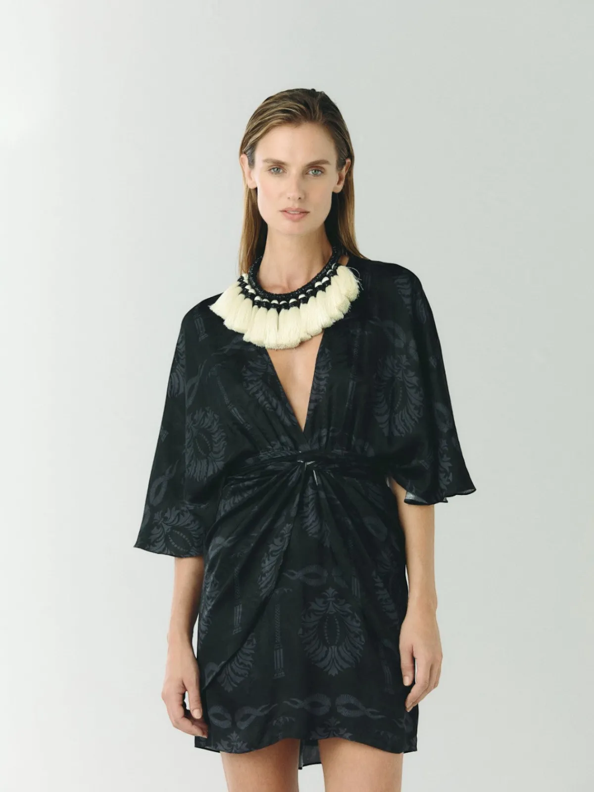 Our Juan de Dios Bruma Necklace in Black u0026amp; White is an embroidered necklace that features tassels made from silk. The necklace has black beads along the strand with a connector in the back. <span data-sheets-userformat='{"2":14845,"3":{"1":0,"3":1},"5":{"1":[{"1":2,"2":0,"5":{"1":2,"2":0}},{"1":0,"2":0,"3":3},{"1":1,"2":0,"4":1}]},"6":{"1":[{"1":2,"2":0,"5":{"1":2,"2":0}},{"1":0,"2":0,"3":3},{"1":1,"2":0,"4":1}]},"7":{"1":[{"1":2,"2":0,"5":{"1":2,"2":0}},{"1":0,"2":0,"3":3},{"1":1,"2":0,"4":1}]},"8":{"1":[{"1":2,"2":0,"5":{"1":2,"2":0}},{"1":0,"2":0,"3":3},{"1":1,"2":0,"4":1}]},"9":0,"10":1,"11":4,"14":{"1":3,"3":1},"15":"Arial","16":12}' data-sheets-value="{u0026quot;1u0026quot;:2,u0026quot;2u0026quot;:u0026quot;The Chiminango Blouse is a feminine one-shoulder, drapped silhouette featuring Juan de Dios's iconic jungle themed silk jacquard woven exclusively for brand. Pair with the Amaime Midi Skirt to create the ultimate evening look.