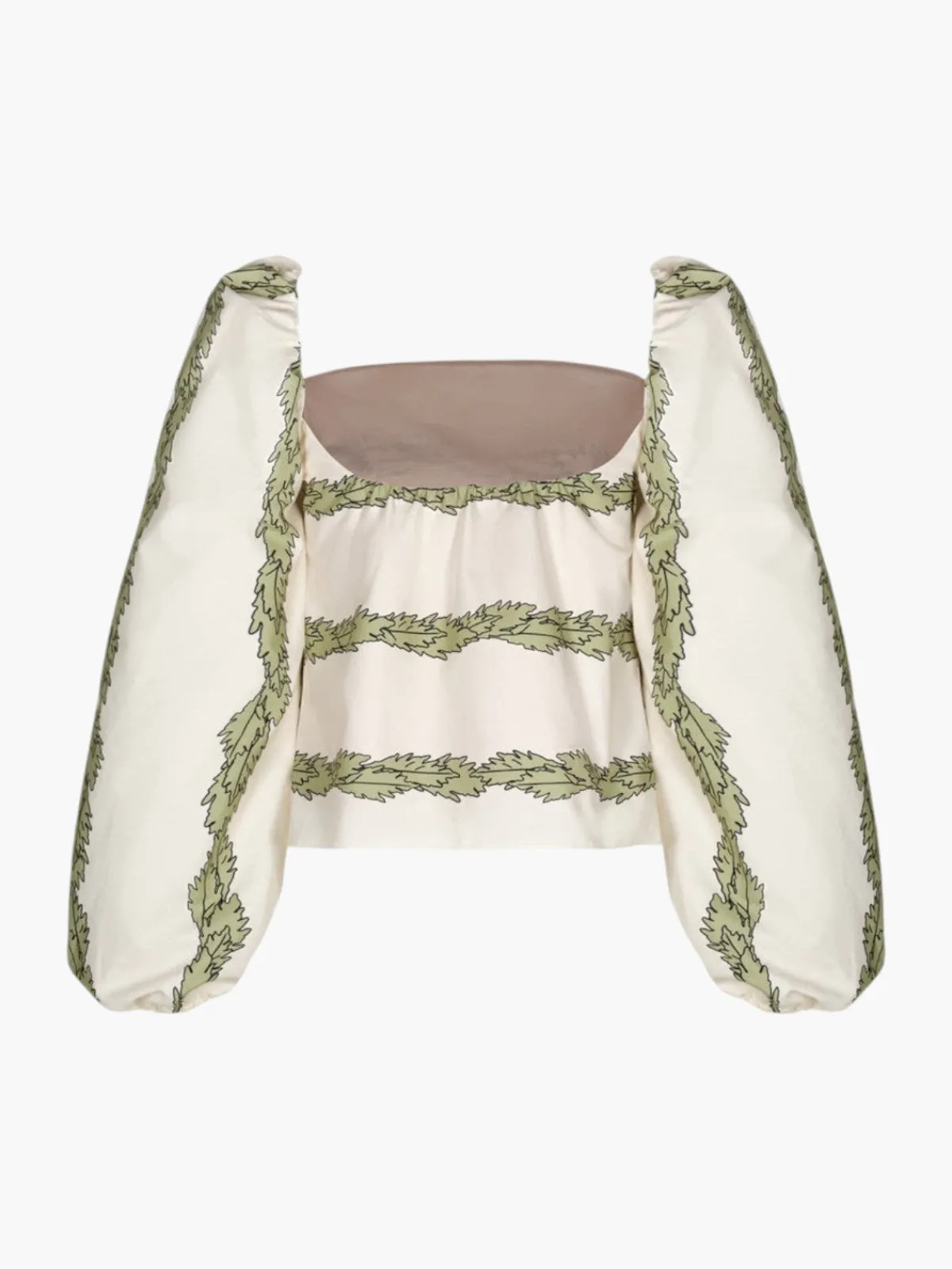 Our Juan de Dios Celia Cotton Blouse in Ivory Striped Helechos is a long sleeve blouse with a straight neckline and puffy sleeves. Handcrafted by female heads of households in Colombia.