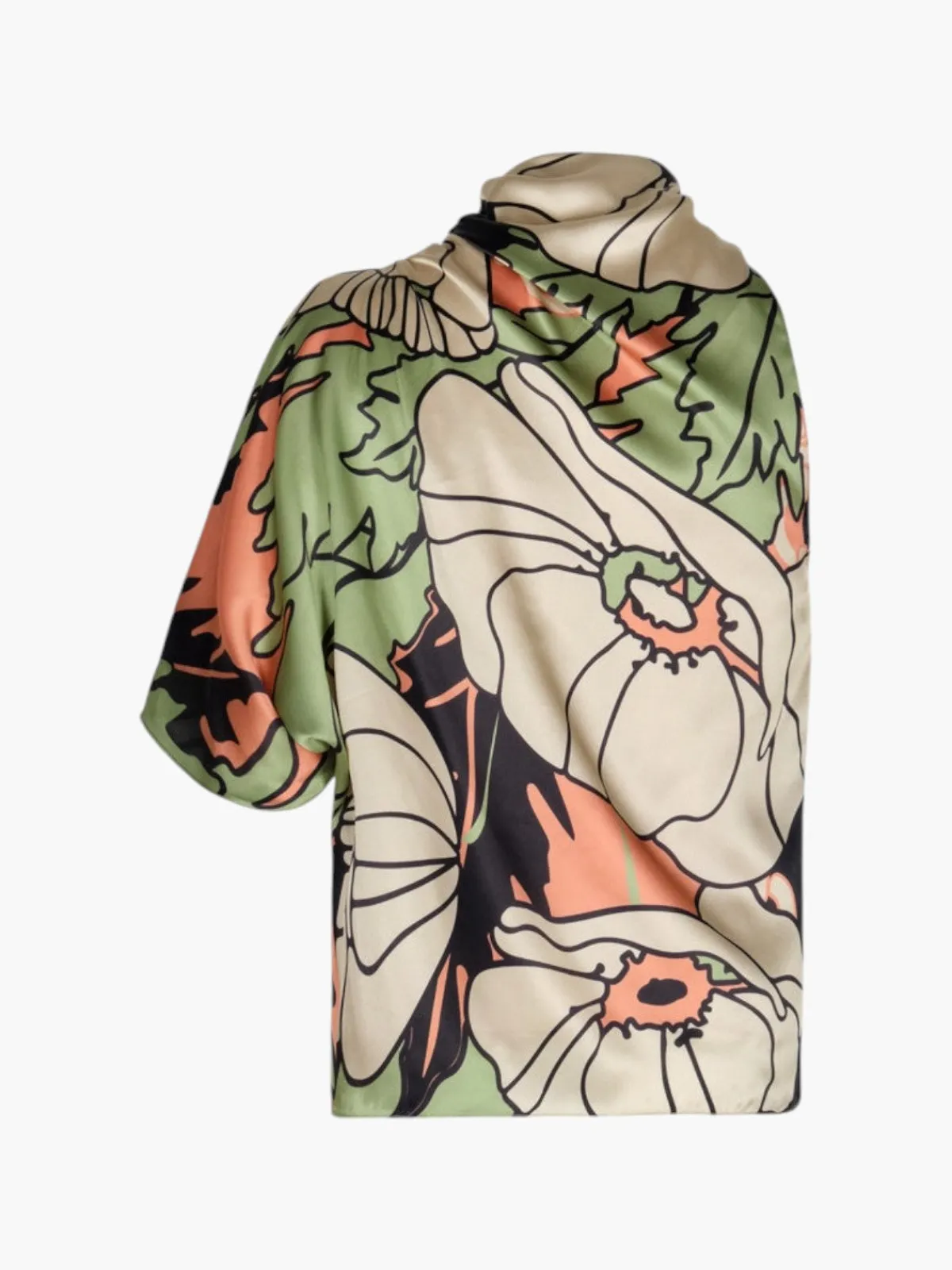 Our Juan de Dios Chiminango Jacquard Blouse in Sage Gladiolos Garden is a one-shoulder silhouette.Handcrafted by female heads of households in Colombia.