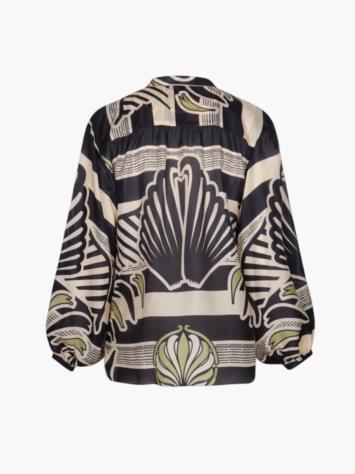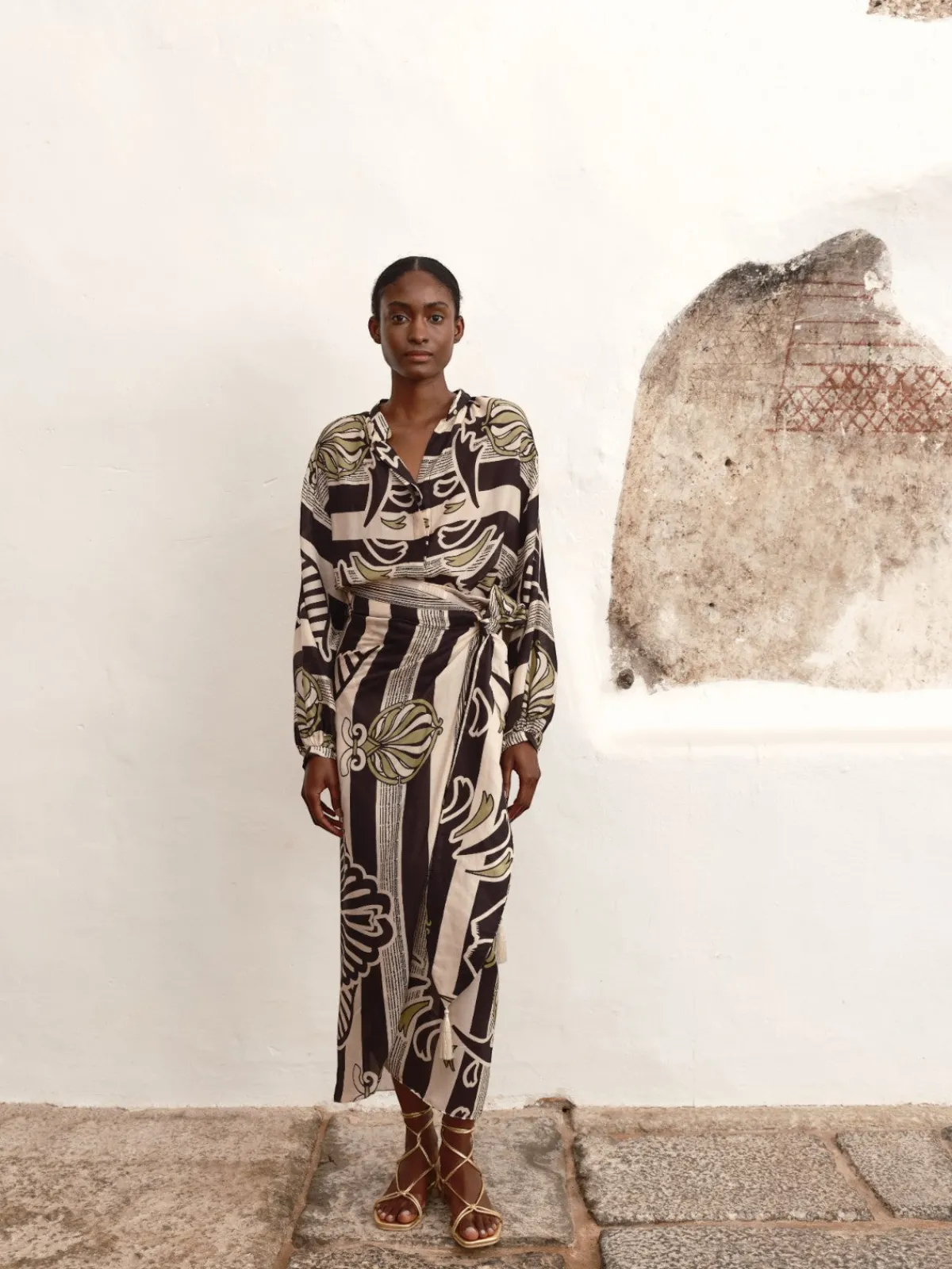 Our Juan de Dios Don Simon Shirt in Navy Ornament Stripes, balloon sleeves and an open neckline with front buttons. Handcrafted in Colombia by female heads of households.