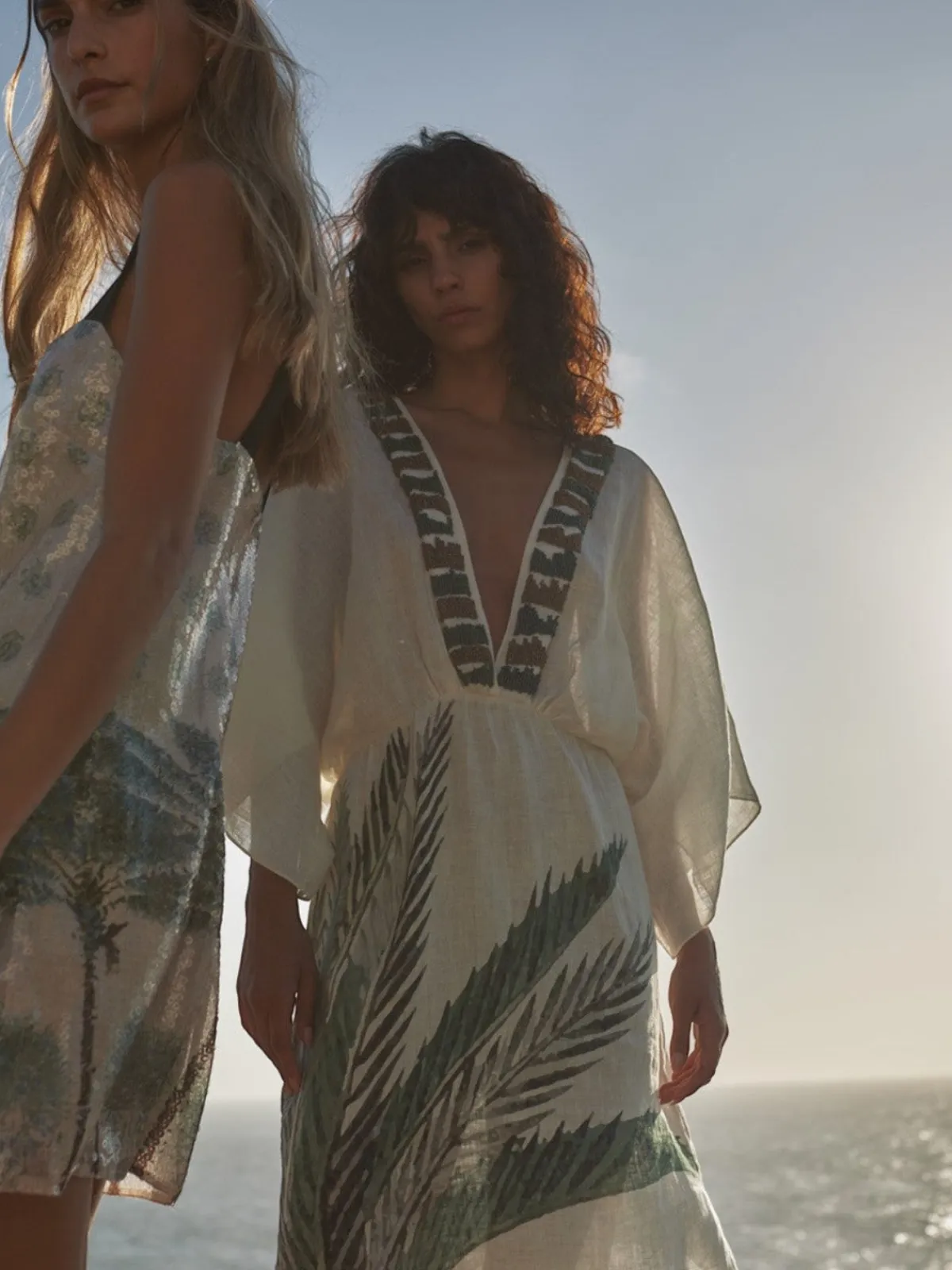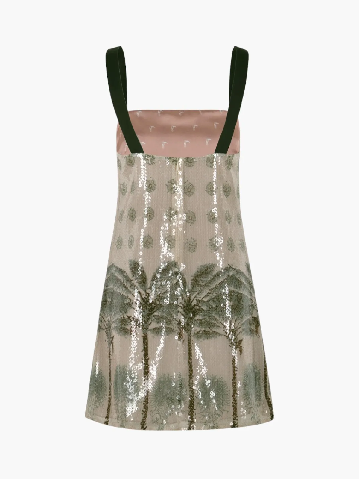 Our Juan di Dios El Club del Clan Sequins Mini Dress in Ivory features a straight neckline, thick ribbon contrasting stripes, and an allover sequined palm pattern. Handcrafted in Colombia by female heads of households.
