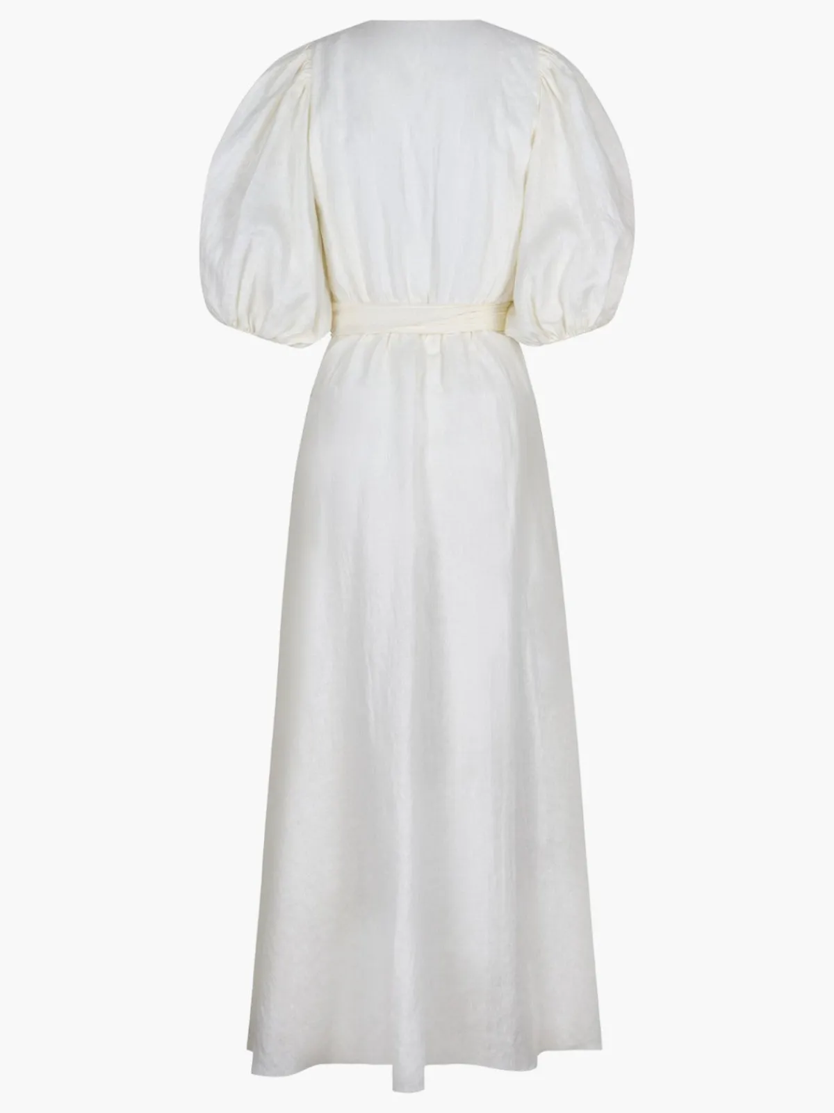 Our Juan de Dios Ermita Linen Maxi Dress in Ivory Palms print is a relaxed maxi dress with puffy sleeves, short sleeves and wrap around front that ties at the side. Handcrafted in Colombia by female heads of households.