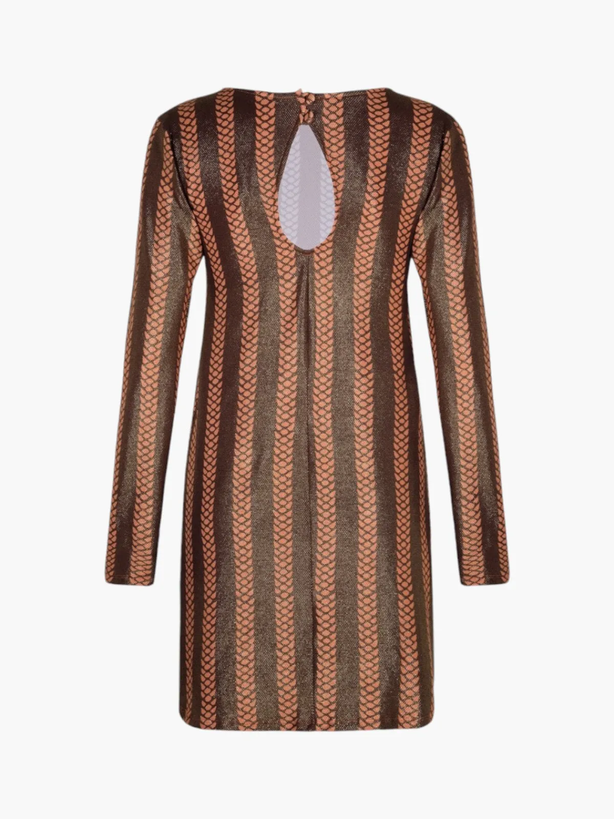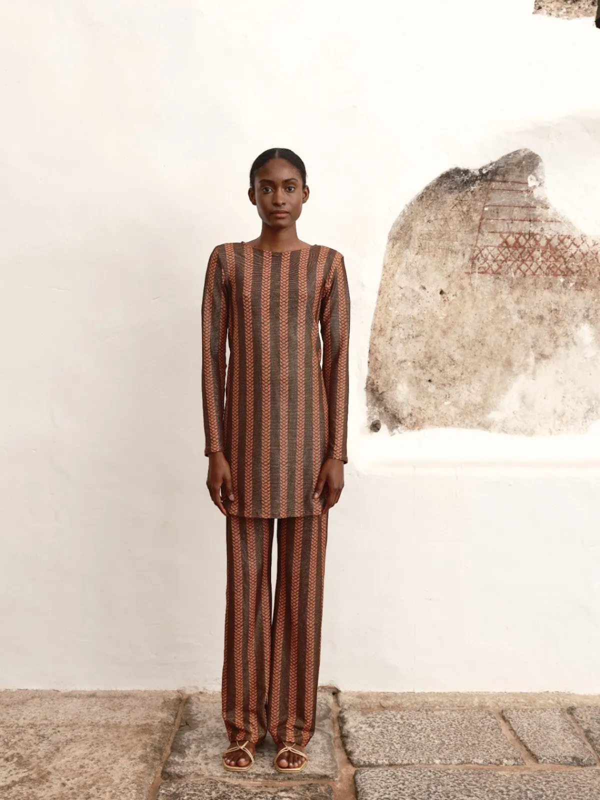 Our Juan de Dios Fado Top in Gold is a metallic serpent patterned long sleeve top.Handcrafted by female heads of households in Colombia.