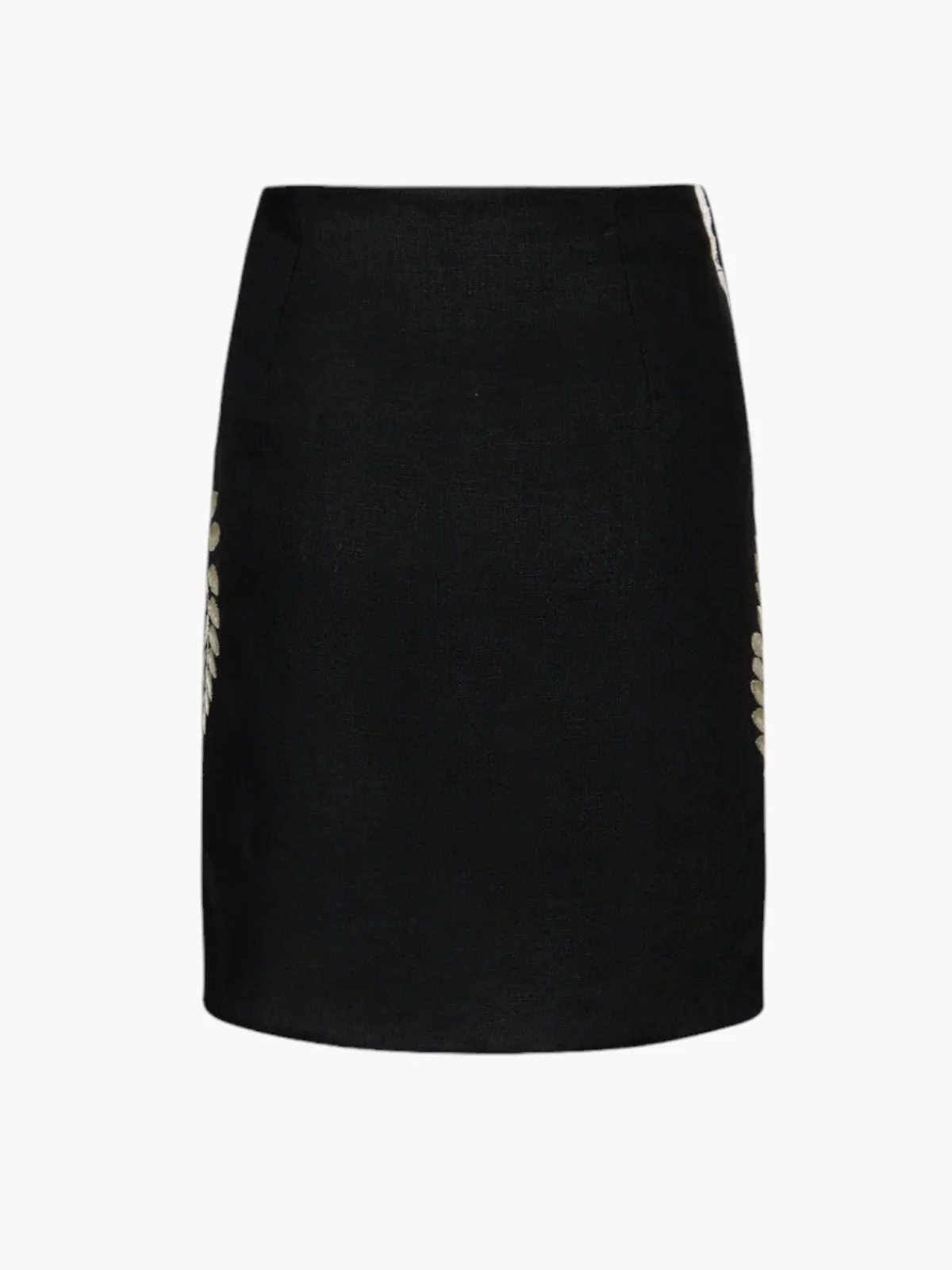 Our Juan de Dios Guainia Embroidered Linen Mini Skirt in Black is a mini length skirt featuring a cinch detail on the side that closes with an invisible hook.Handcrafted by female heads of households in Colombia.