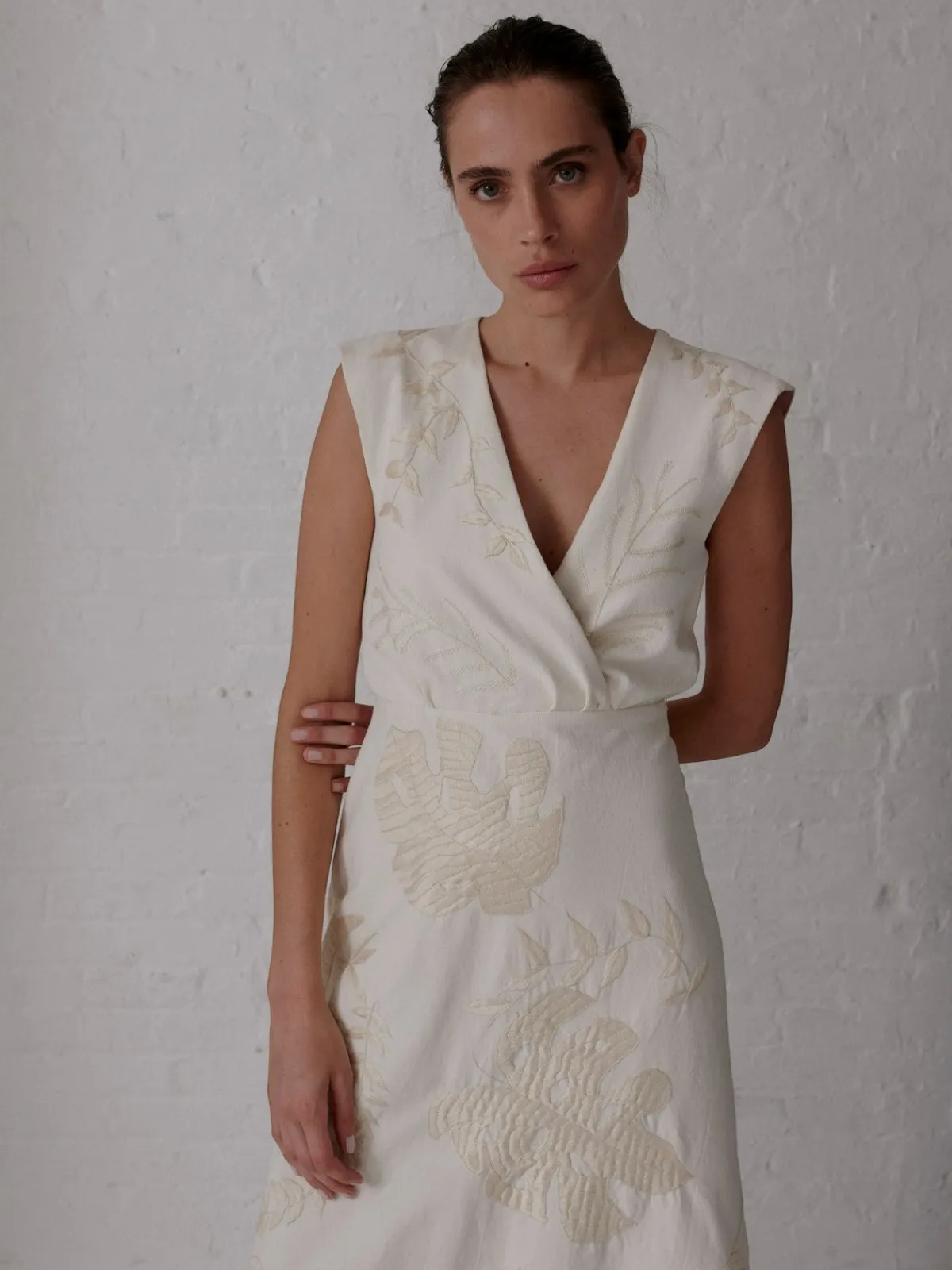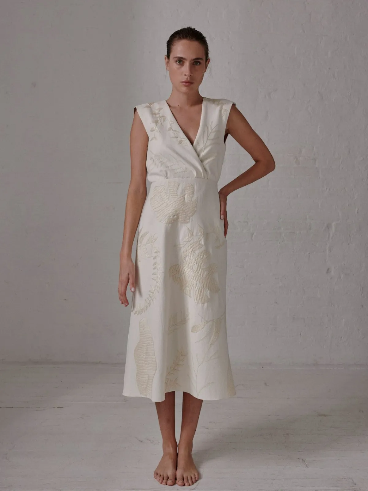 Midi skirt u0026quot;}”>Our Juan de Dios Gualanday Canvas Hand Embroidered Midi Dress in Ecru is a piece of art that takes over 72 hours to embroider by hand. This dress features a v-neckline with cap style sleeves, a large keyhole opening in the back and an invisible zipper closure at back. Handcrafted in Colombia by female heads of households.