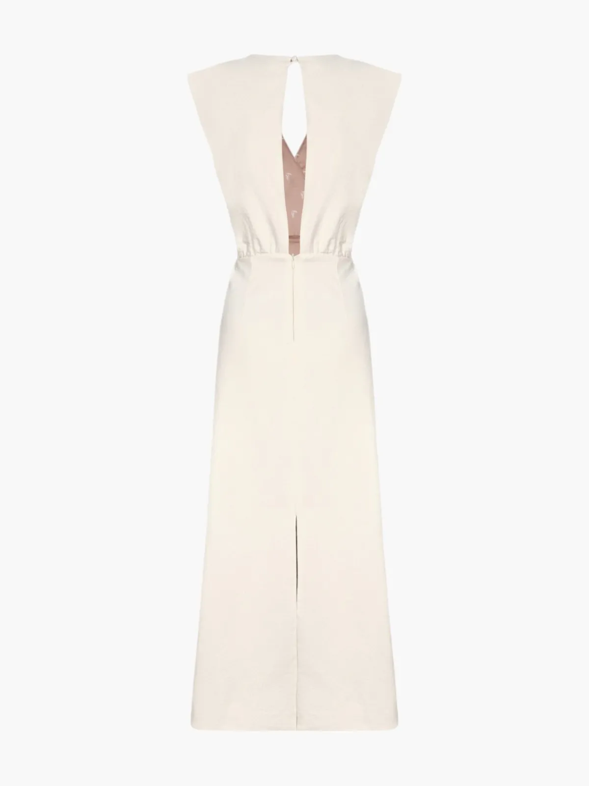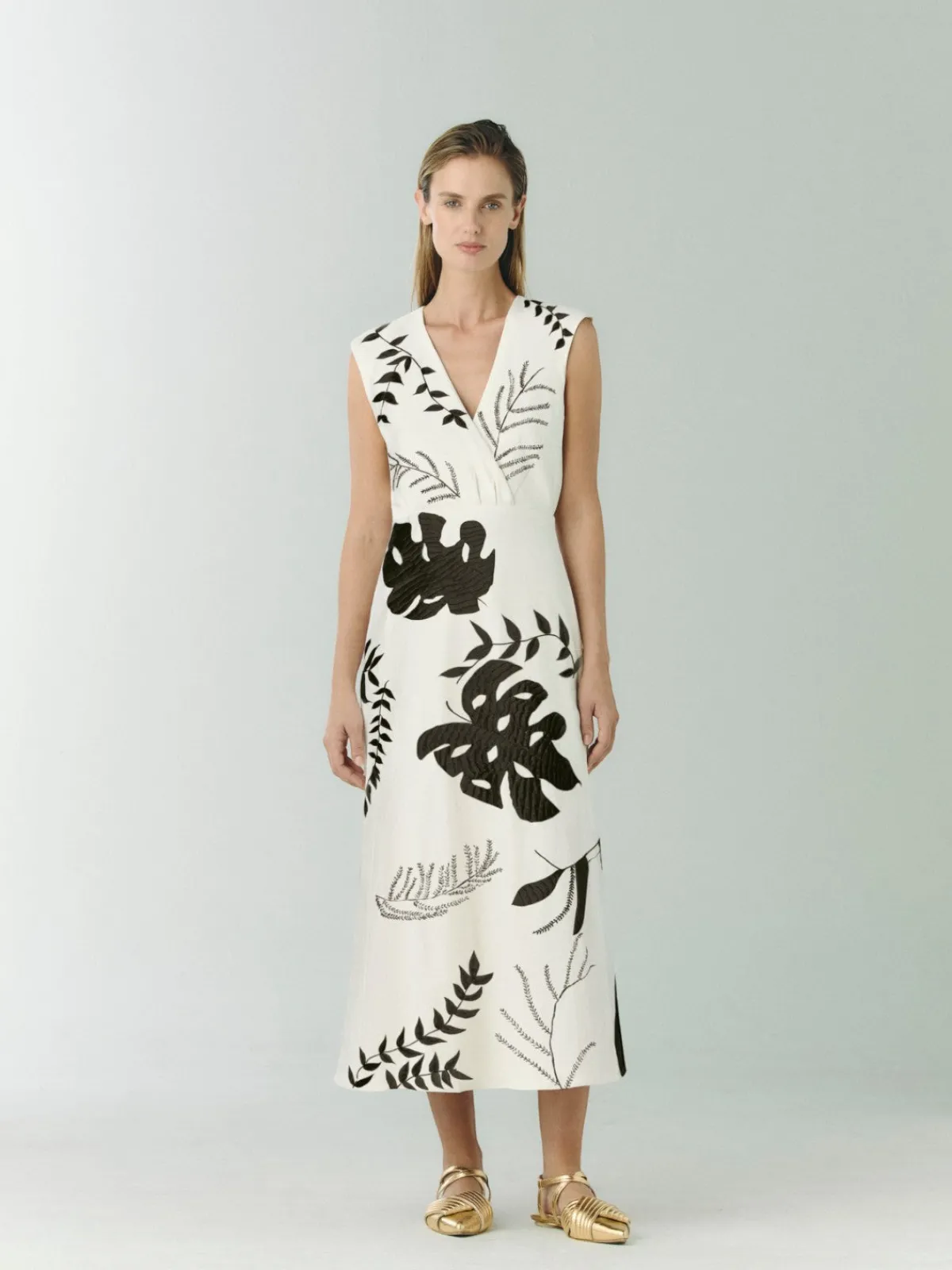 Our Juan de Dios Gualanday Canvas Hand Embroidered Midi Dress in Ecru Black is a midi length dress with a V-neckline. The front of dress features a hand-embroidered print. The back is a solid ecru with a cut-out in the back and a back slit. Handcrafted in Colombia by female heads of households.