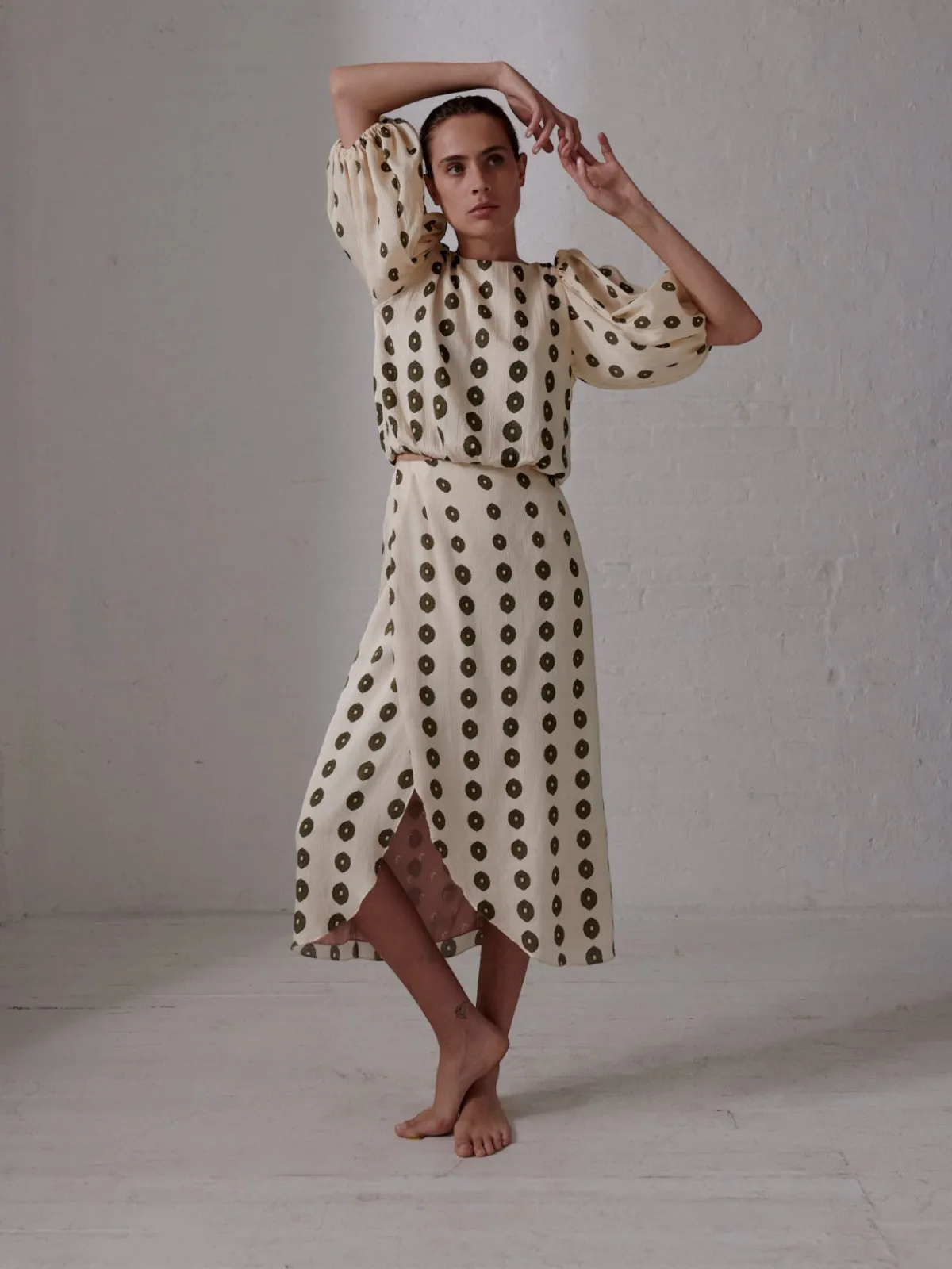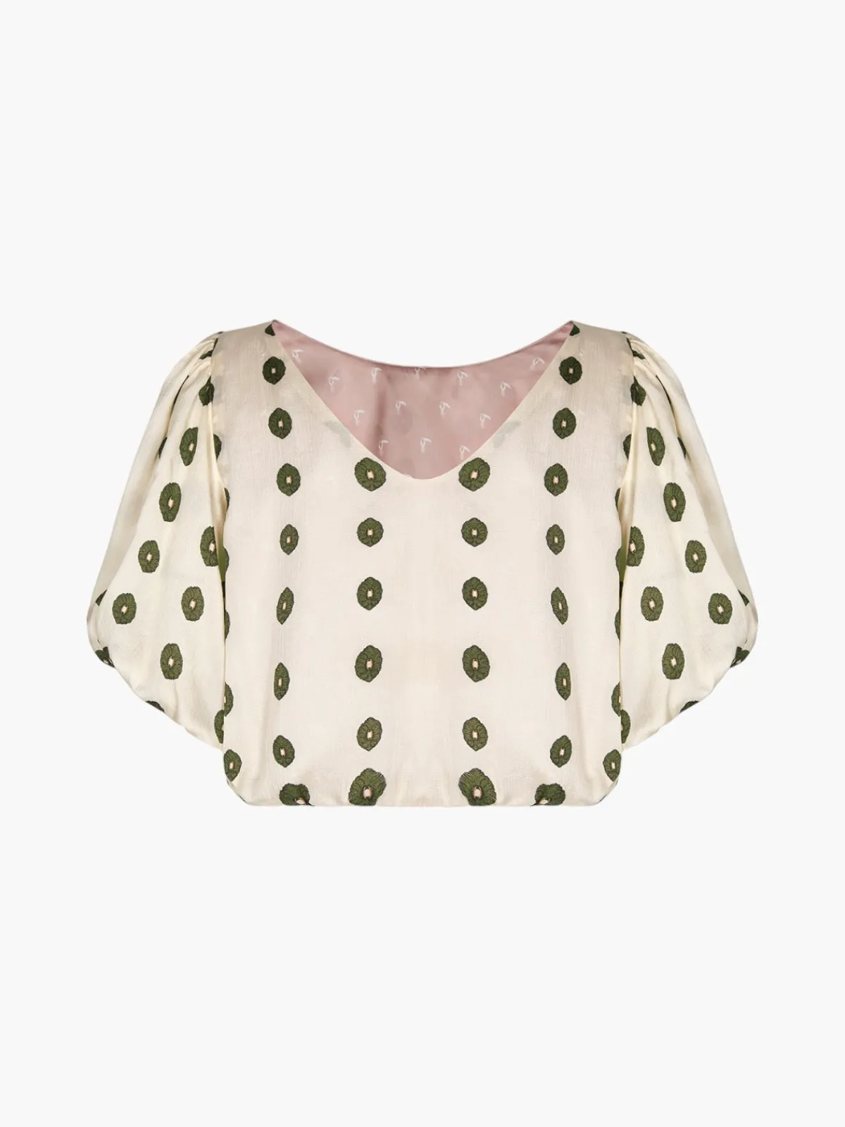 Our Juan de Dios Guayacan Silk Martellato Blouse in Ivory Green Chintz entails a cropped silhouette and balloon sleeves. It is a pull on style top. Pair with the Amaime Midi Skirt to complete the look.Handcrafted in Colombia by female heads of households.