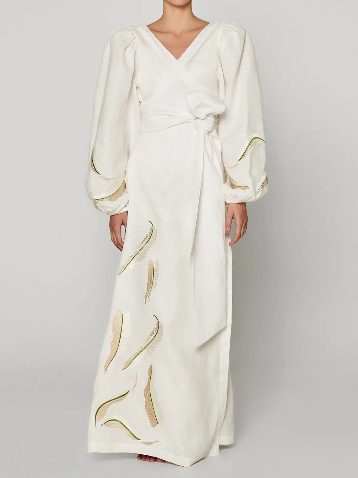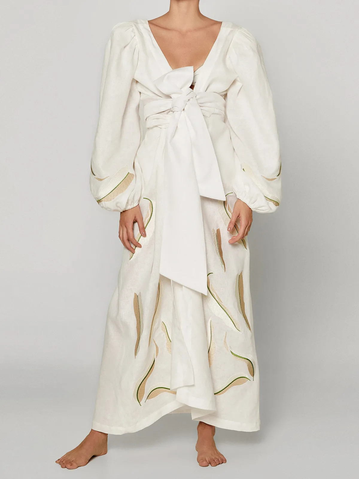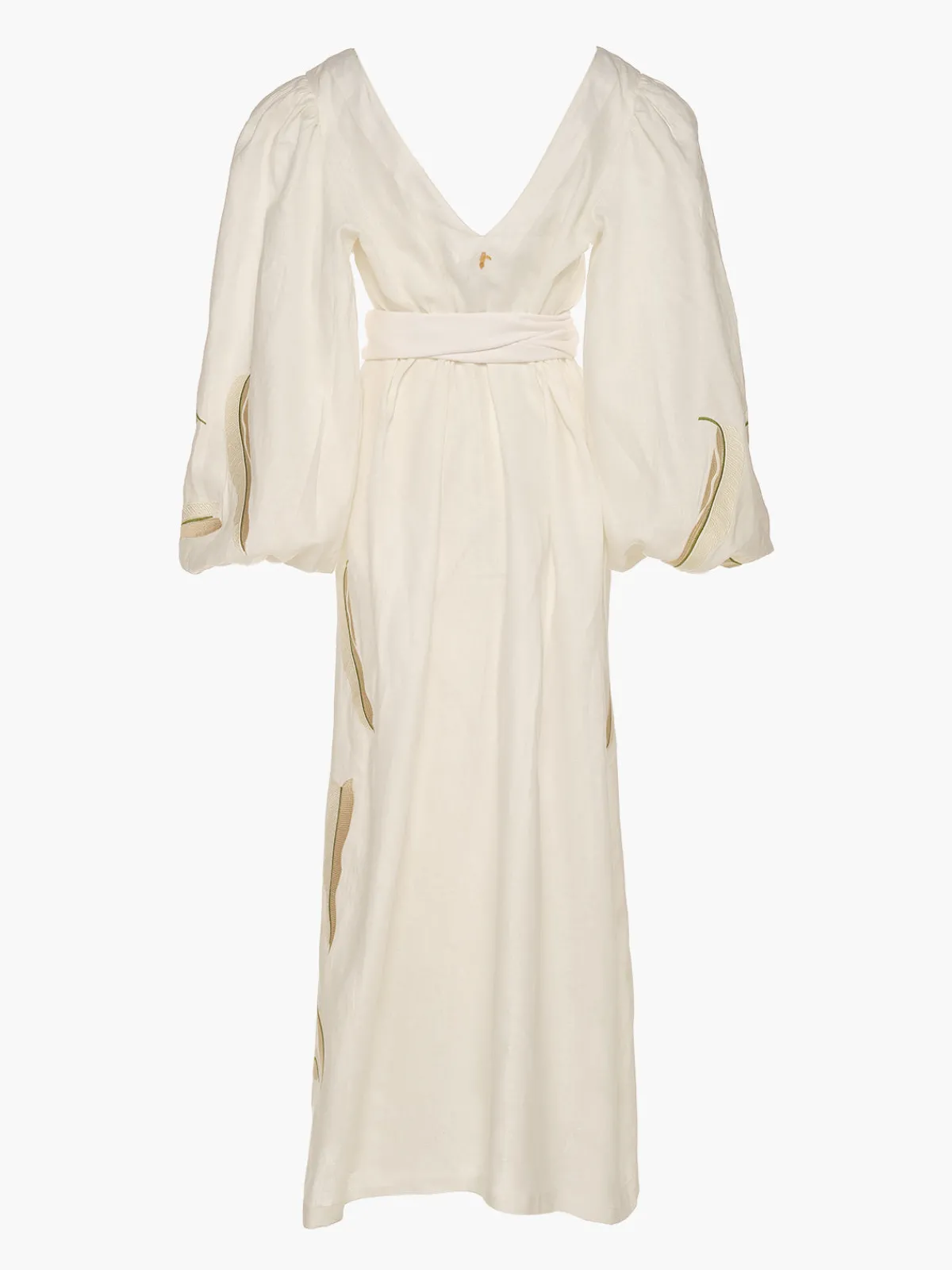 Our Juan de Dios Leticia Linen Dress in Ivory offers a carefree look with puffed sleeves and a V-neckline. In a full A-line silhouette, it features embroidered accents and a self-fabric tie belt at the waist. Crafted by artisans in Colombia.
