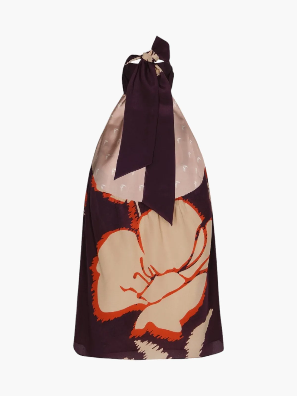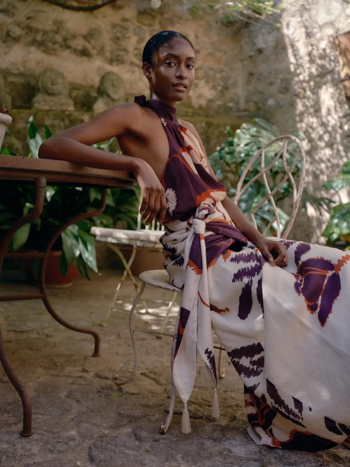 Our Juan De Dios Magdalena Crepe Chine Blouse in Purple Gladiolos is a halter style top in a flower print.Handcrafted by female heads of households in Colombia.