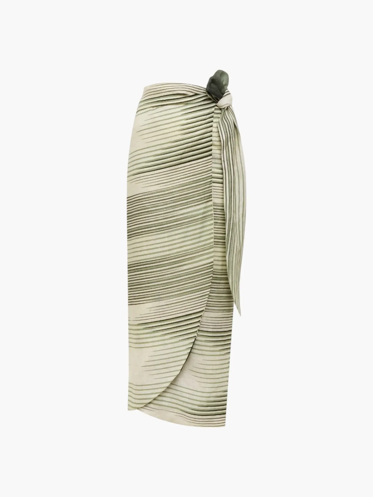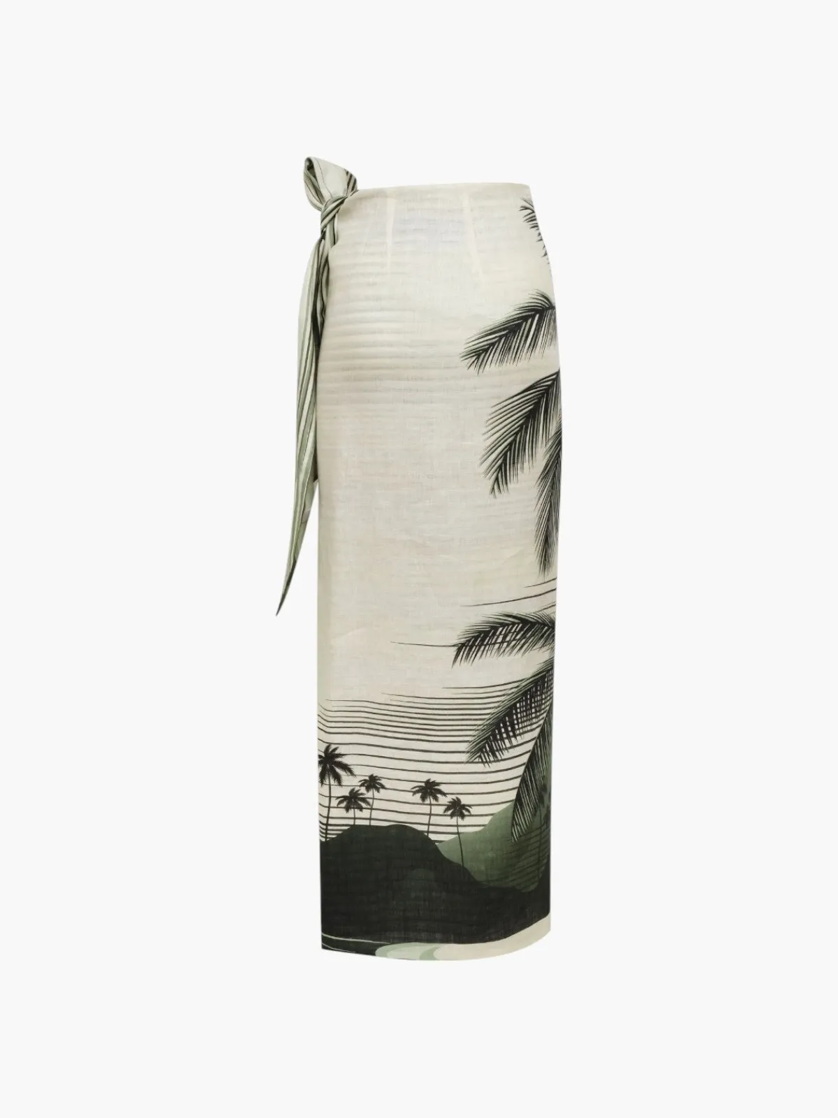 Our Juan de Dios Mapara Skirt in Green Tropical Landscape, a lightweight wrap-around midi skirt with an underdress slip. This skirt is reversible. Handcrafted in Colombia by female heads of households.