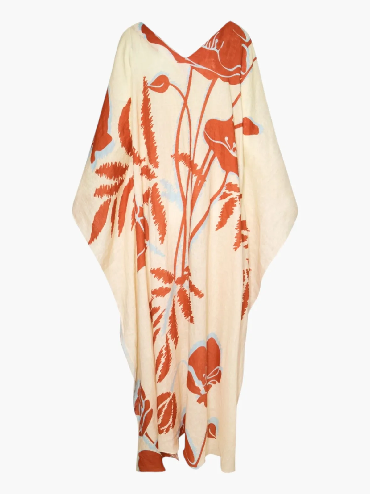 Our Juan de Dios Morena Cotton Silk Closed Tunic in Ecru/Orange Gladiolos features a loose, relaxed fit with a V-neckline and a removable tie belt. Handcrafted by female heads of households in Colombia.