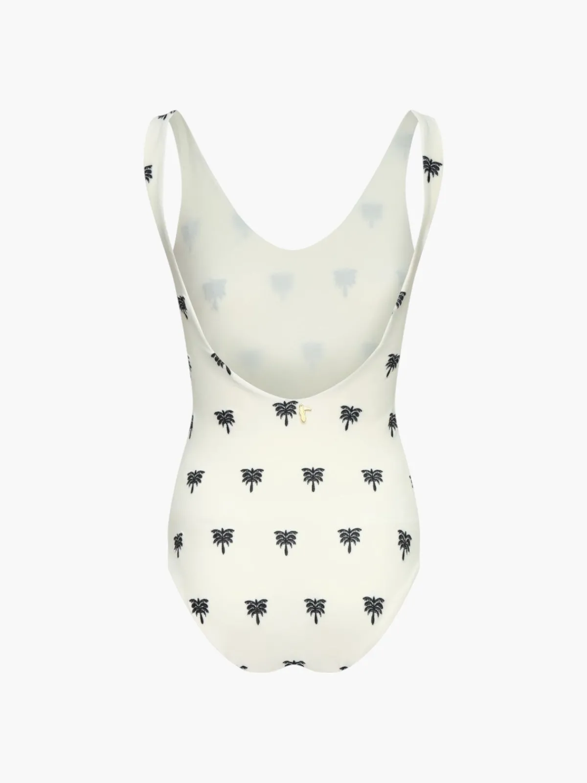 Our Juan de Dios Olympic Embroidered One Piece in Ivory/Black Polka Palms a classic silhouette featuring a feminine U back and an impeccable fit. Handcrafted in Colombia by female heads of households.