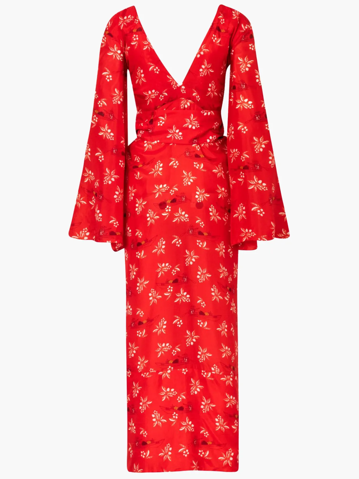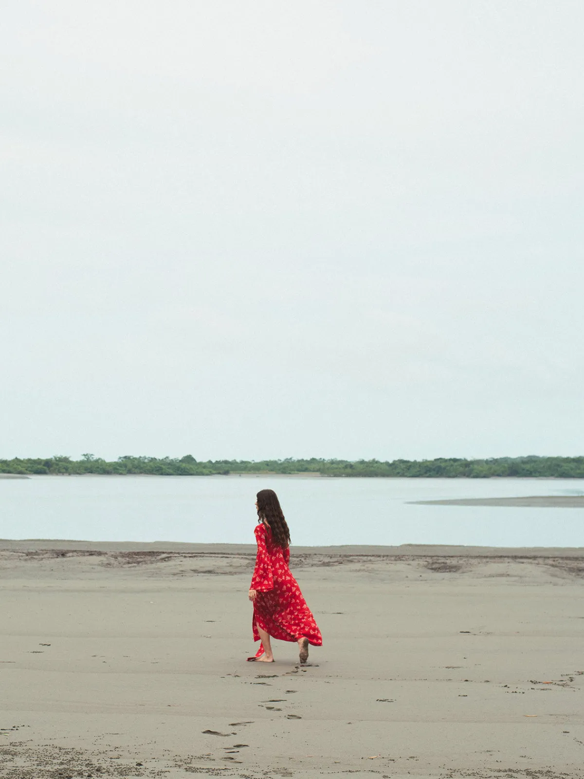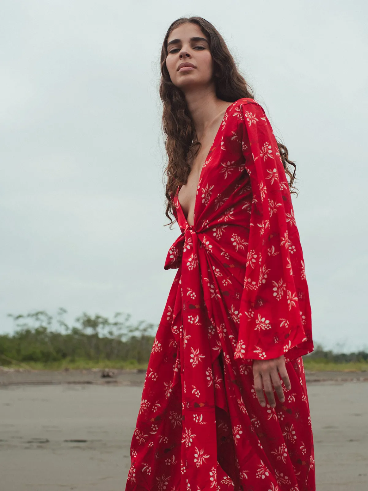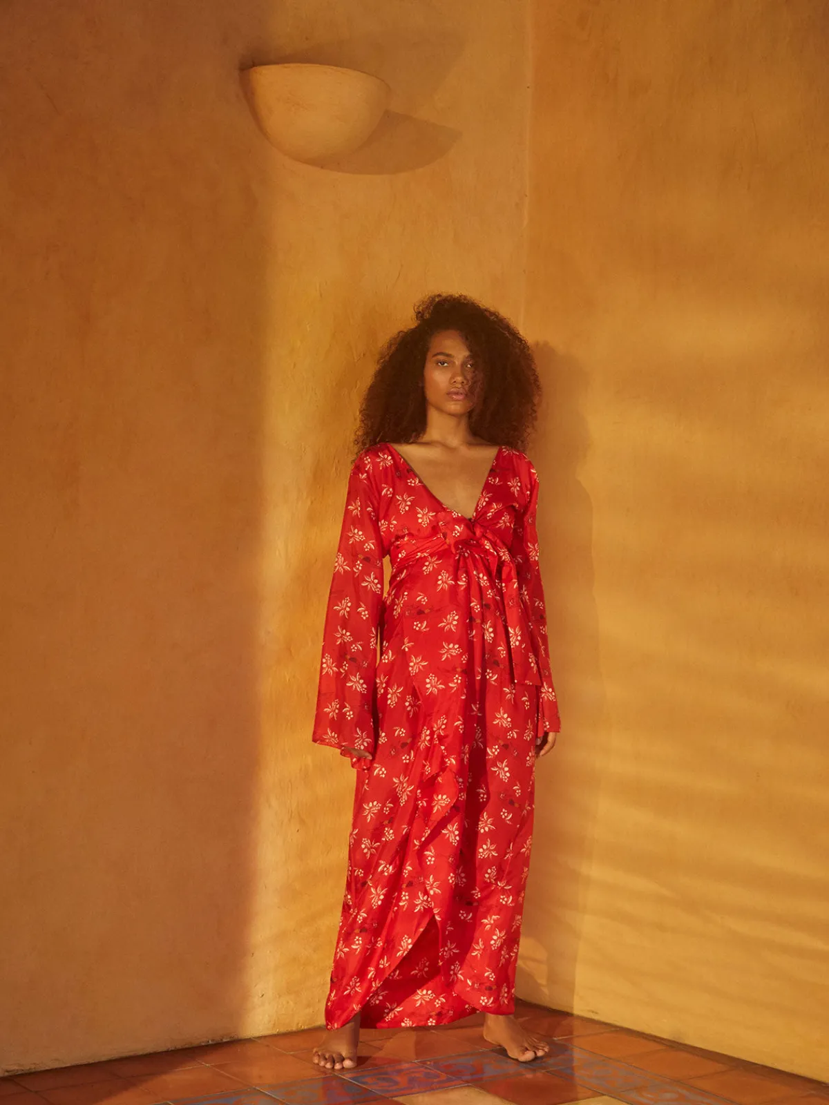 Our Juan de Dios Pacifico Silk Maxi Dress in Red Chontaduro features a wrap silhouette with long kimono sleeves, a V-neckline, and a tie at the waist that can be draped in front or back. Handcrafted in Colombia by female heads of households.