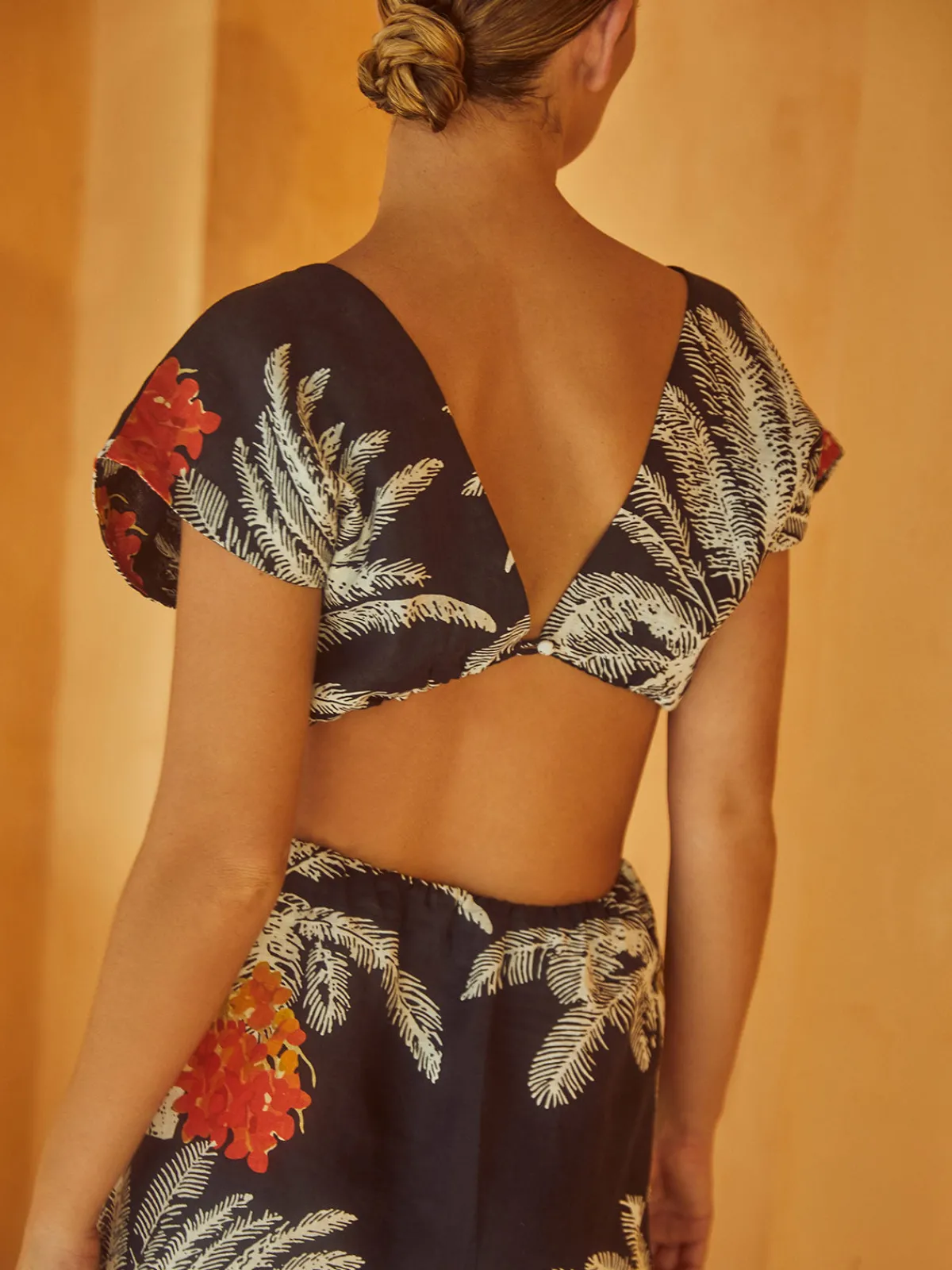 Our Juan de Dios Quinto Sol Linen Mini Dress in Black Palms boasts a cut out silhouette with open sides, a V-neckline, and an allover print. Finished with an invisible zipper closure in back. Handcrafted in Colombia by female heads of households.