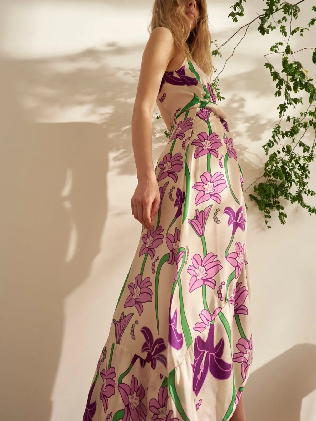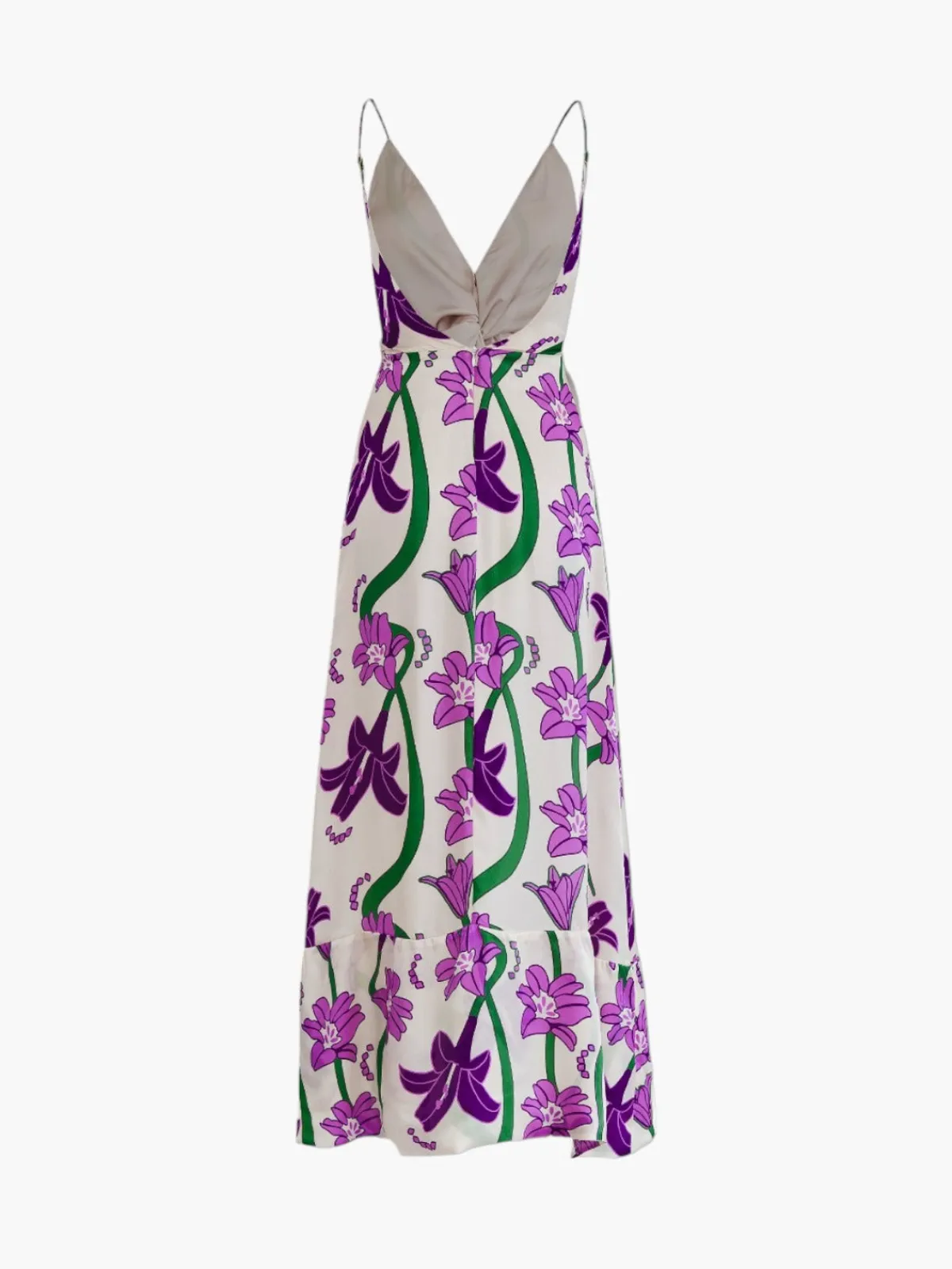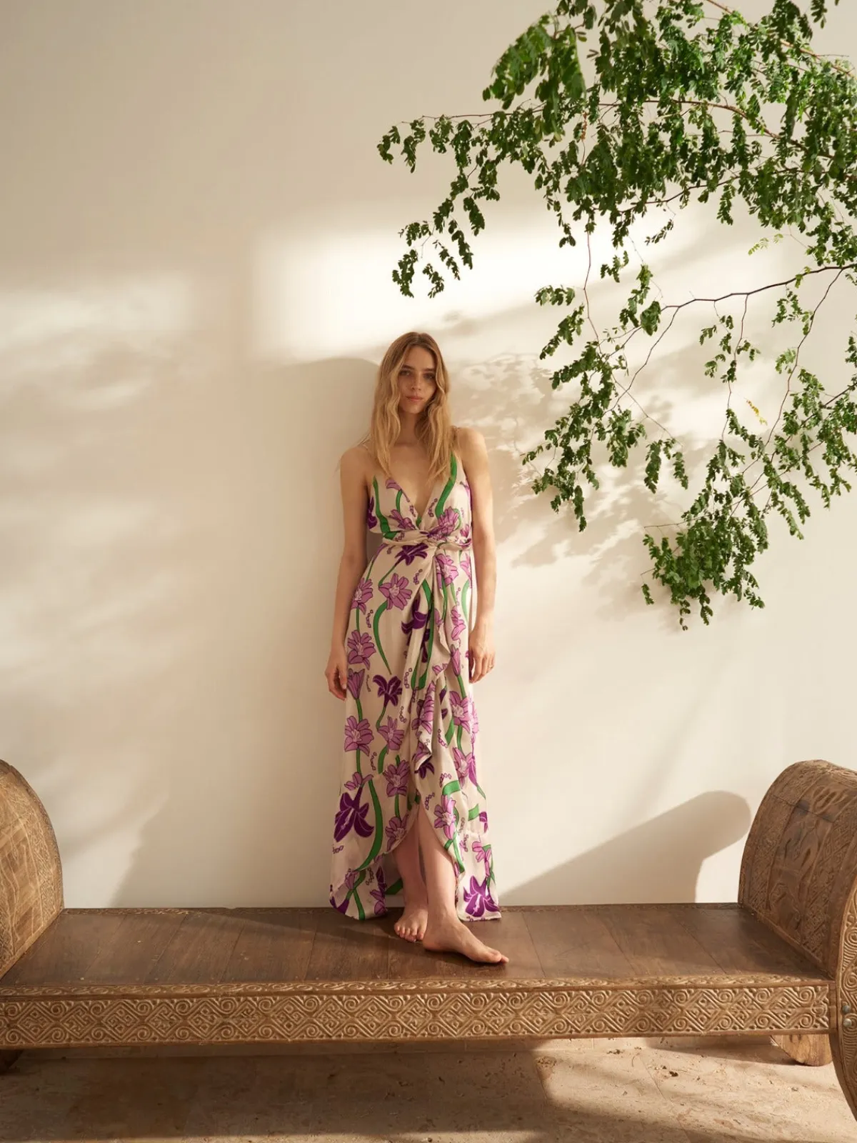 “}’>Our Juan de Dios Sabina Silk Dress in Violet Flowers exemplifies sophistication with its feminine silhouette. This maxi dress has a deep-v neckline with a low back.Handcrafted in Colombia by female heads of households.