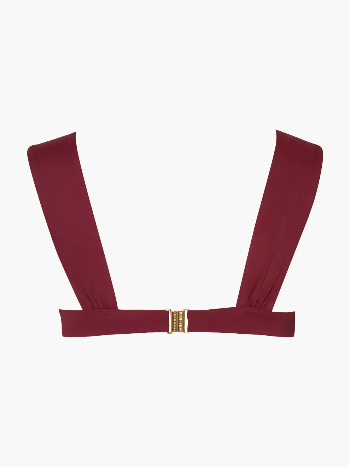 Our Juan de Dios Sabina Top in Wine features a colorblocked design in a wide strap silhouette with a sweetheart neckline and a brooch closure in back. Handcrafted in Colombia by female heads of households.
