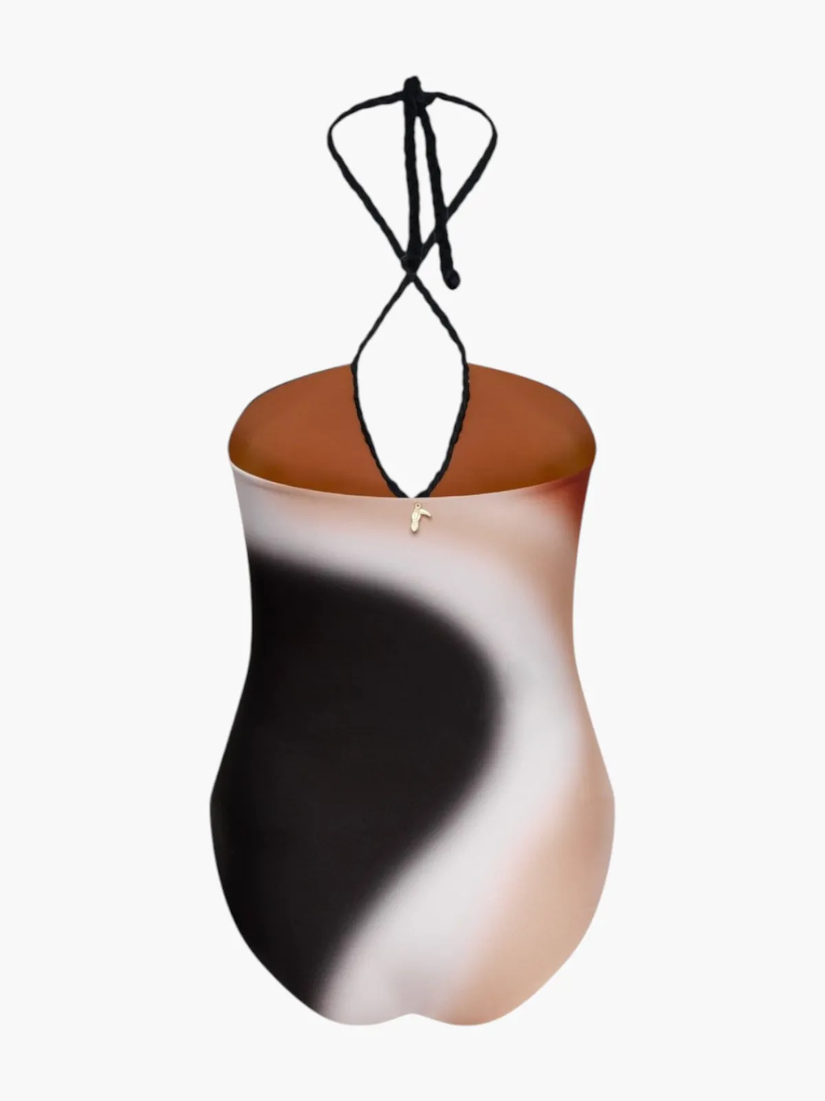 Our Juan de Dios Saint-Tropez One Piece in Black Nude Tie Dye features a V-neckline, peekaboo cut outs, embroidered details and adjustable braided straps to create more than one neckline. Handcrafted in Colombia by female heads of households.