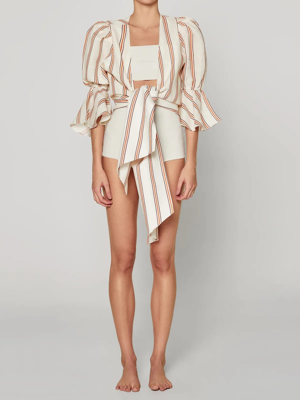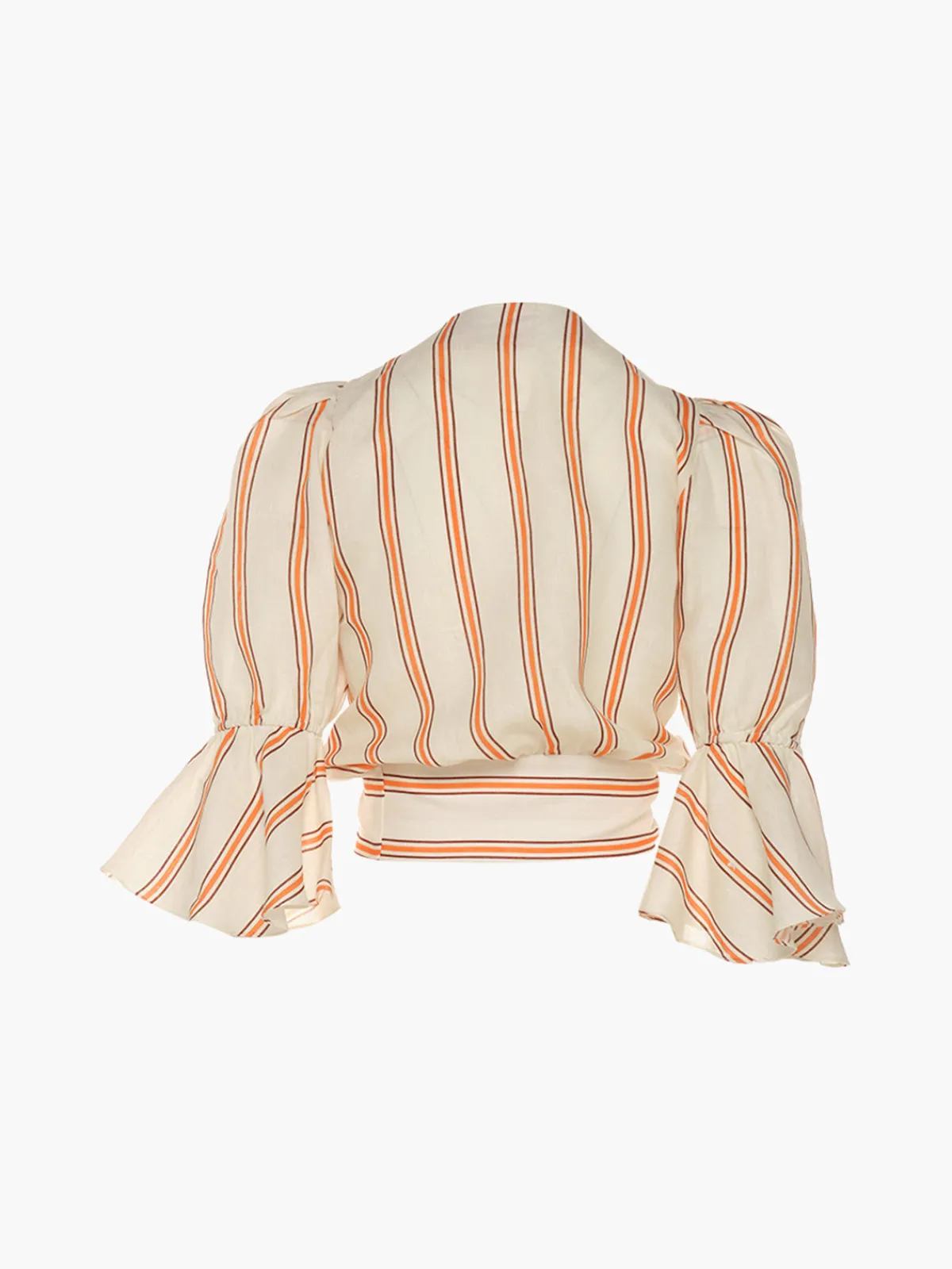 Our Juan de Dios Salsa Linen Shirt in Orange Stripes features an allover print in a cropped silhouette with 3/4 length puff sleeves, a V-neckline, and a front tie. Crafted by artisans in Colombia.