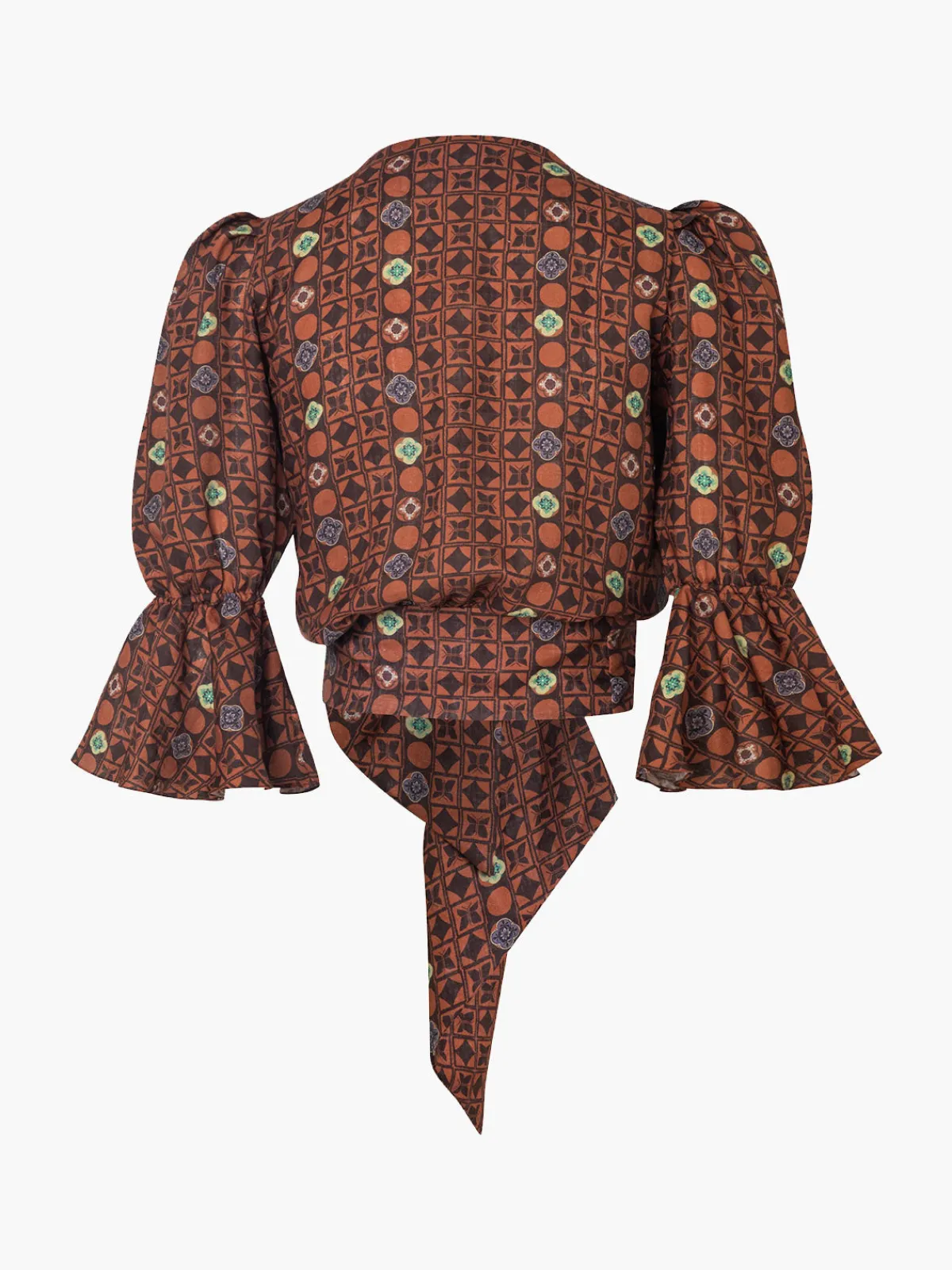 Our Juan de Dios Salsa Linen Shirt in Terracota Mosaic features puffed shoulders, 3/4 length sleeves, a deep V-neckline, and a cropped hem with a tie at the waist. Handcrafted in Colombia by female heads of households.