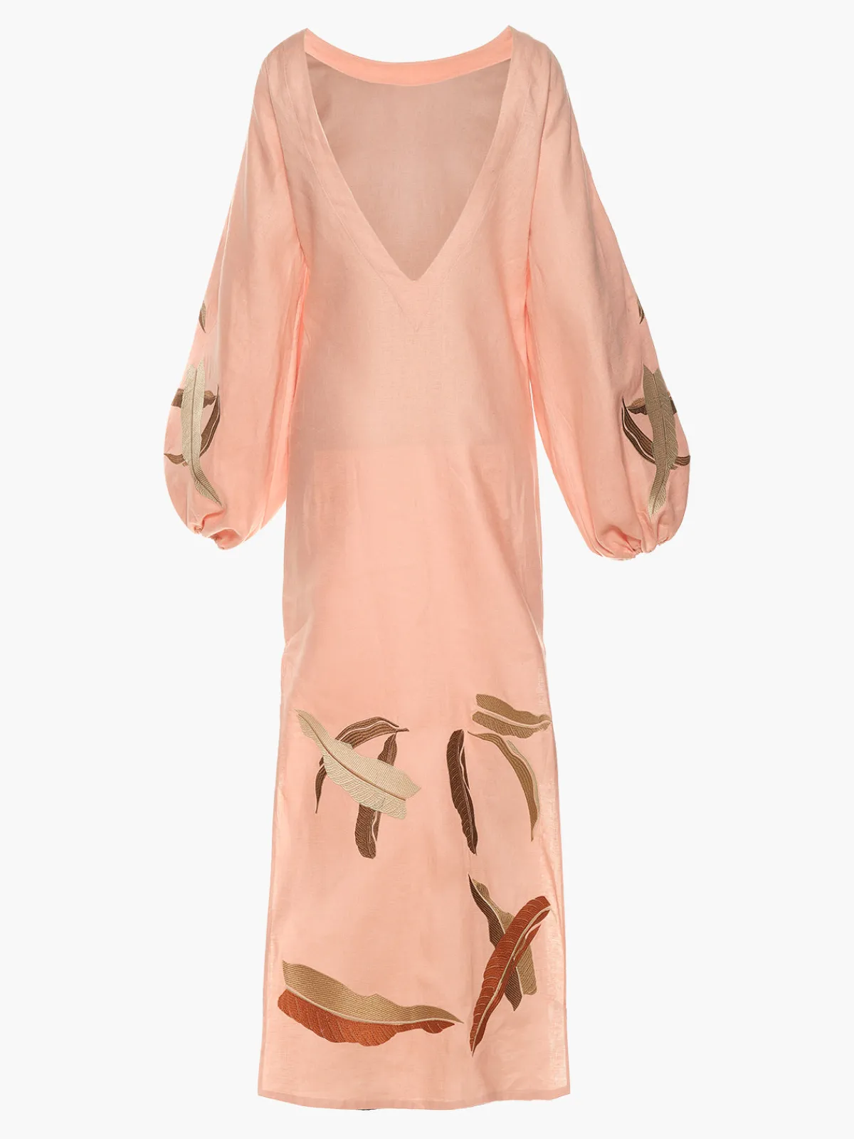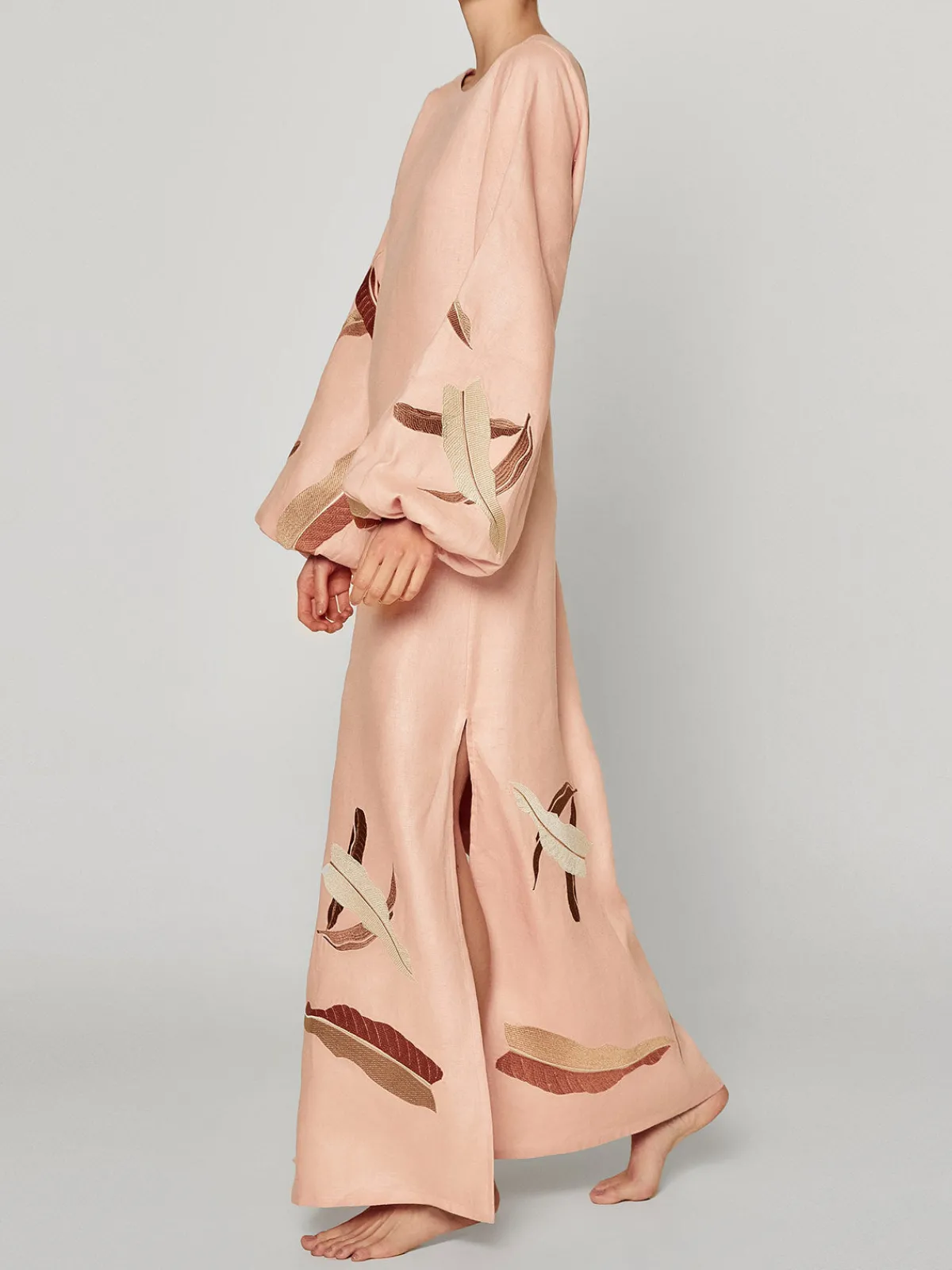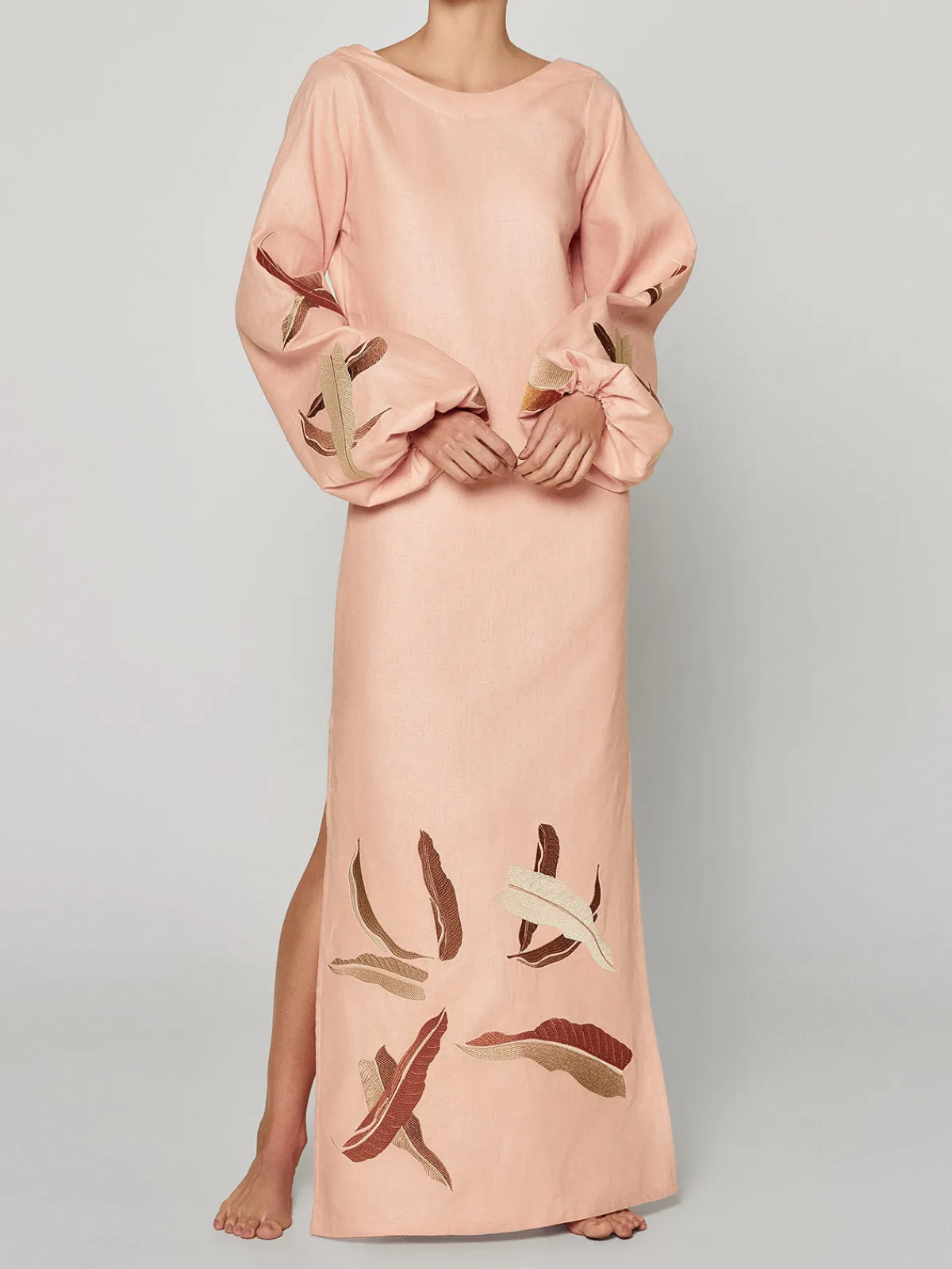 Our Juan de Dios Saman Dress features a maxi silhouette with long puffed sleeves, a round neckline, and embroidered accents at the sleeves and hem. It’s detailed with a slit hem and a zipper closure on the side. Crafted by artisans in Colombia.