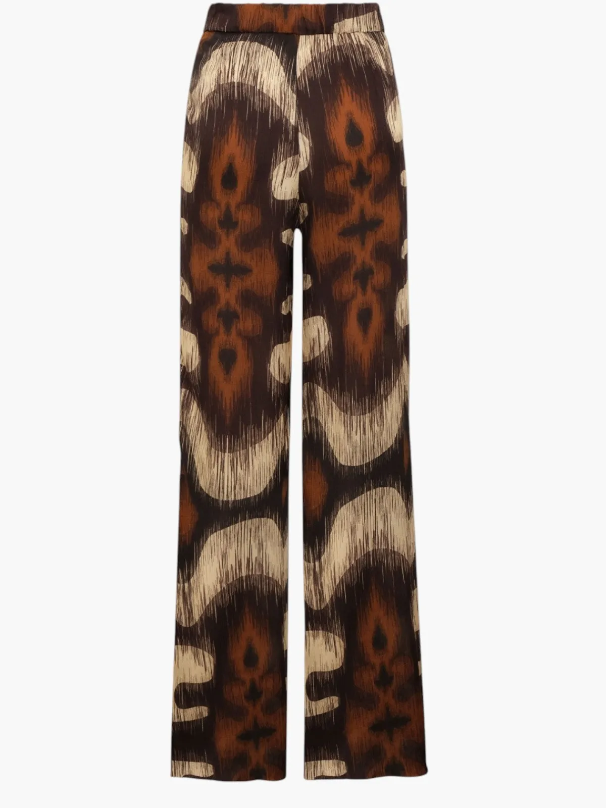 Our Juan de Dios San Benito Cotton Silk Pants in Brown Ikat feature a flattering high elastic waistline with a wide leg silhouette. Handcrafted in Colombia by female heads of households.