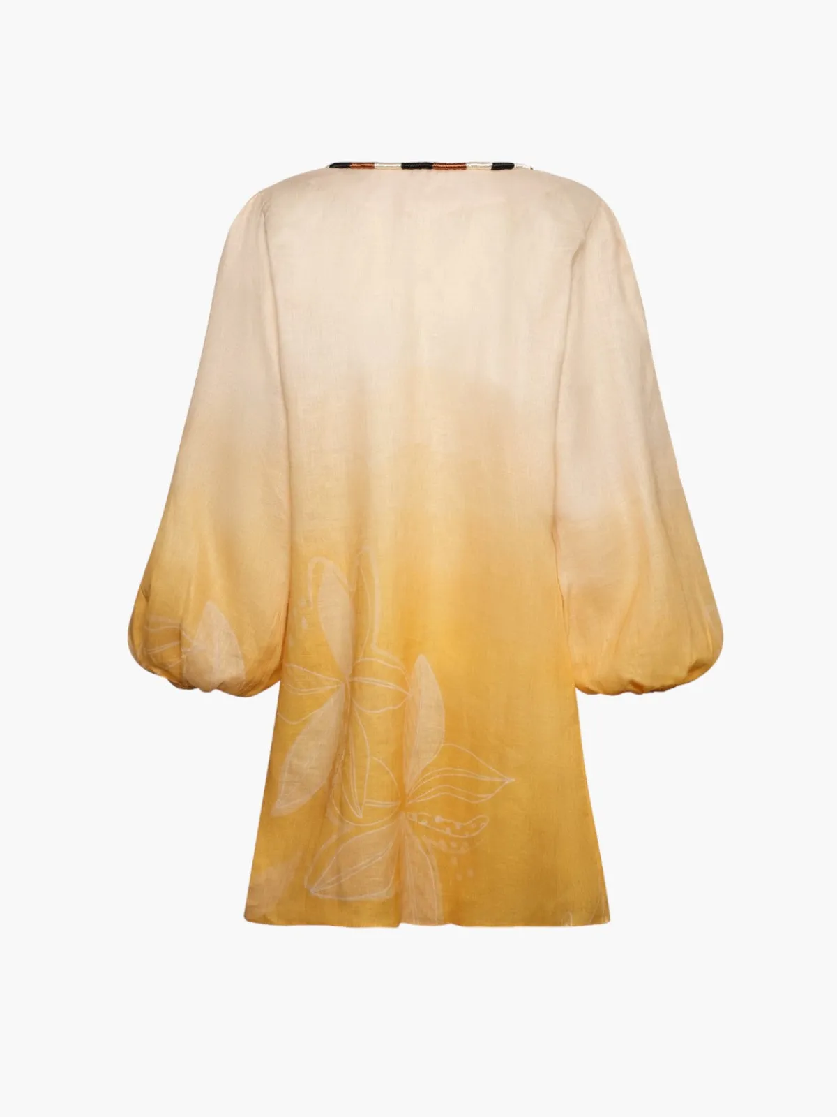 Our Juan de Dios San Marco Linen Mini Dress in Yellow features an effortless loose silhouette with long blouson sleeves, a V-neckline with color-blocked detailing and an allover palm print. Handcrafted in Colombia by female heads of households.