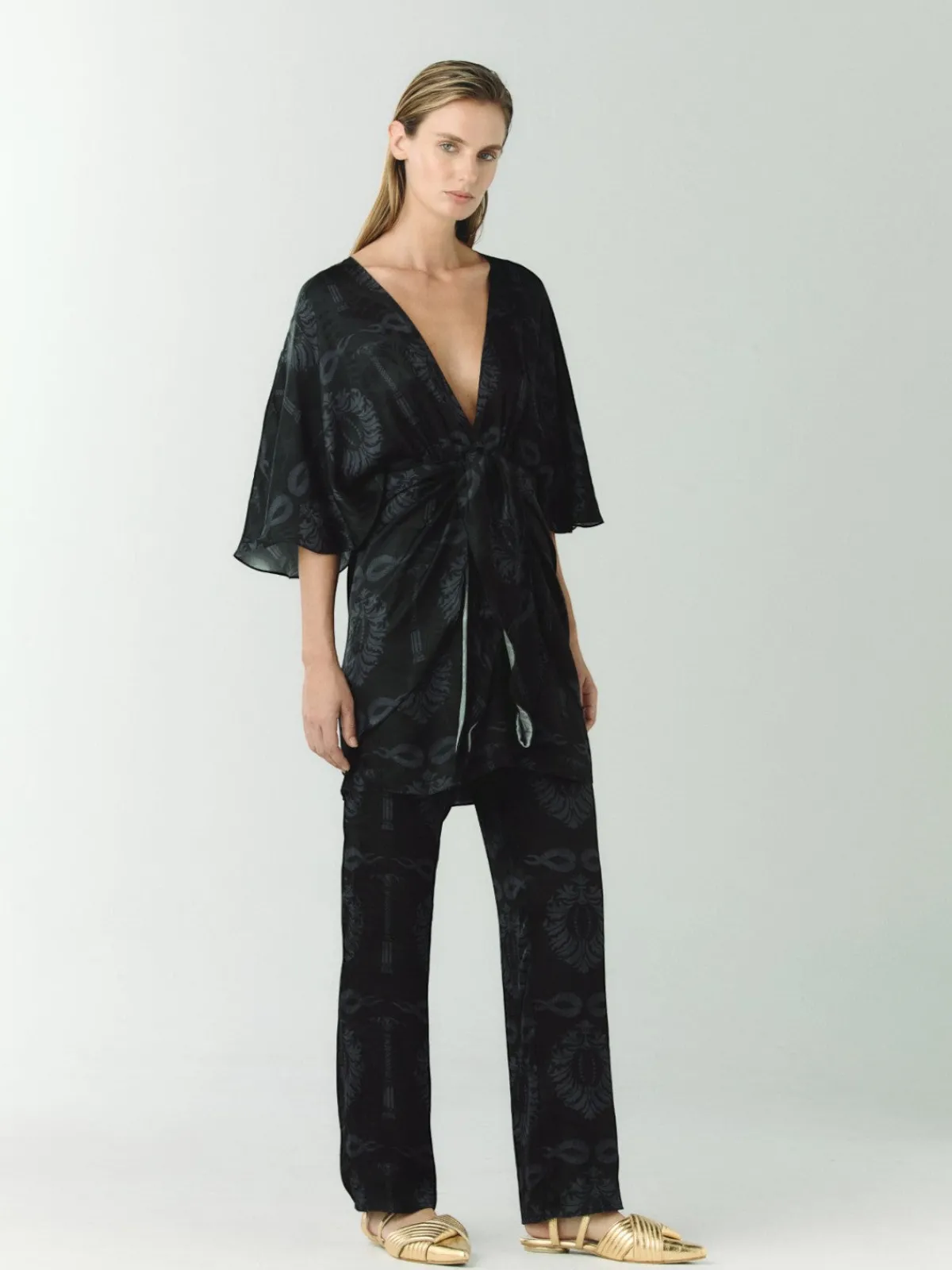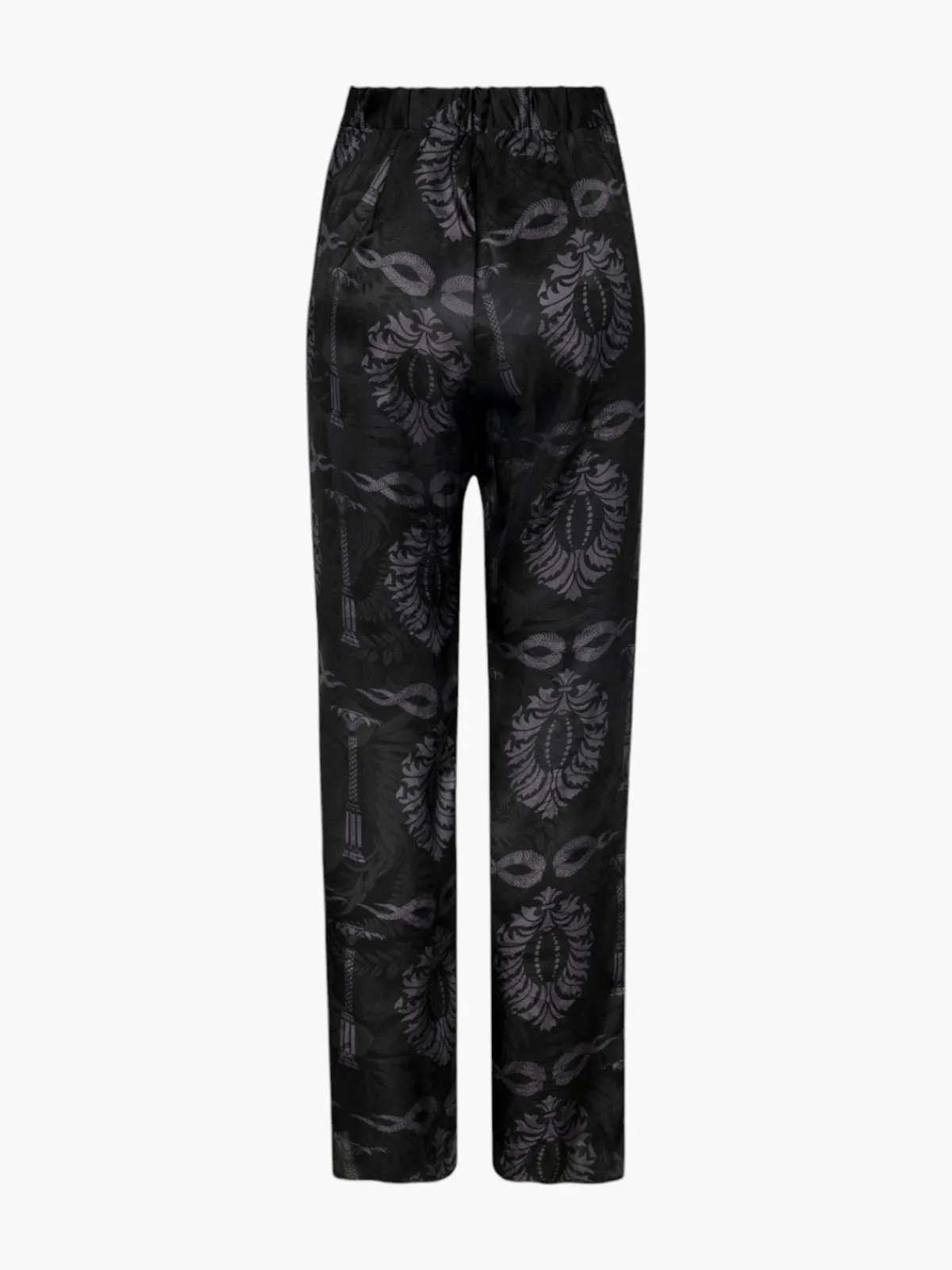Our Juan de Dios Santo Tomas Silk Jacquard Pants in Black is a high waisted pant with wide leg silhouette. This pant features side pockets with zipper closure on the side. Handcrafted in Colombia by female heads of households.