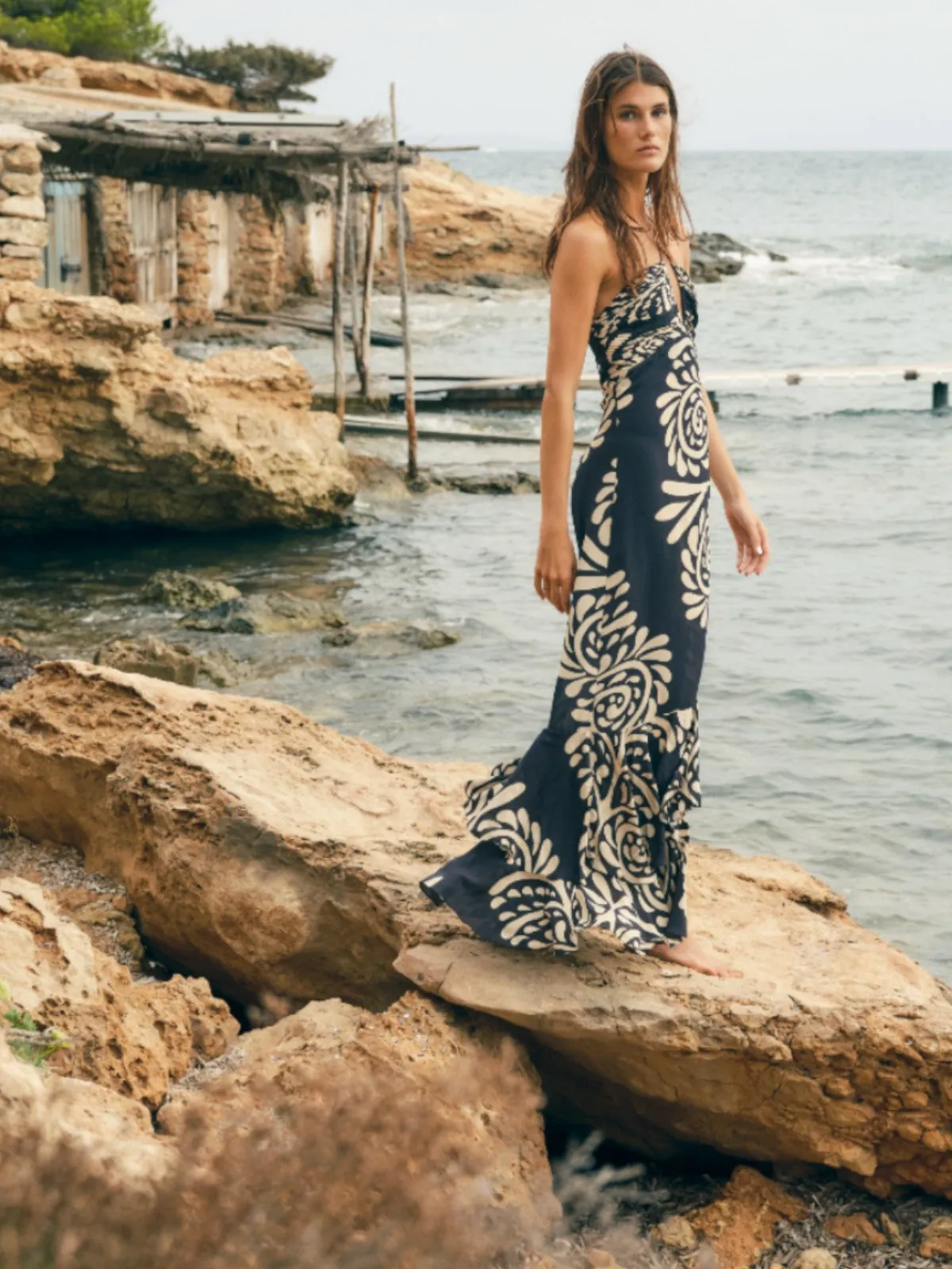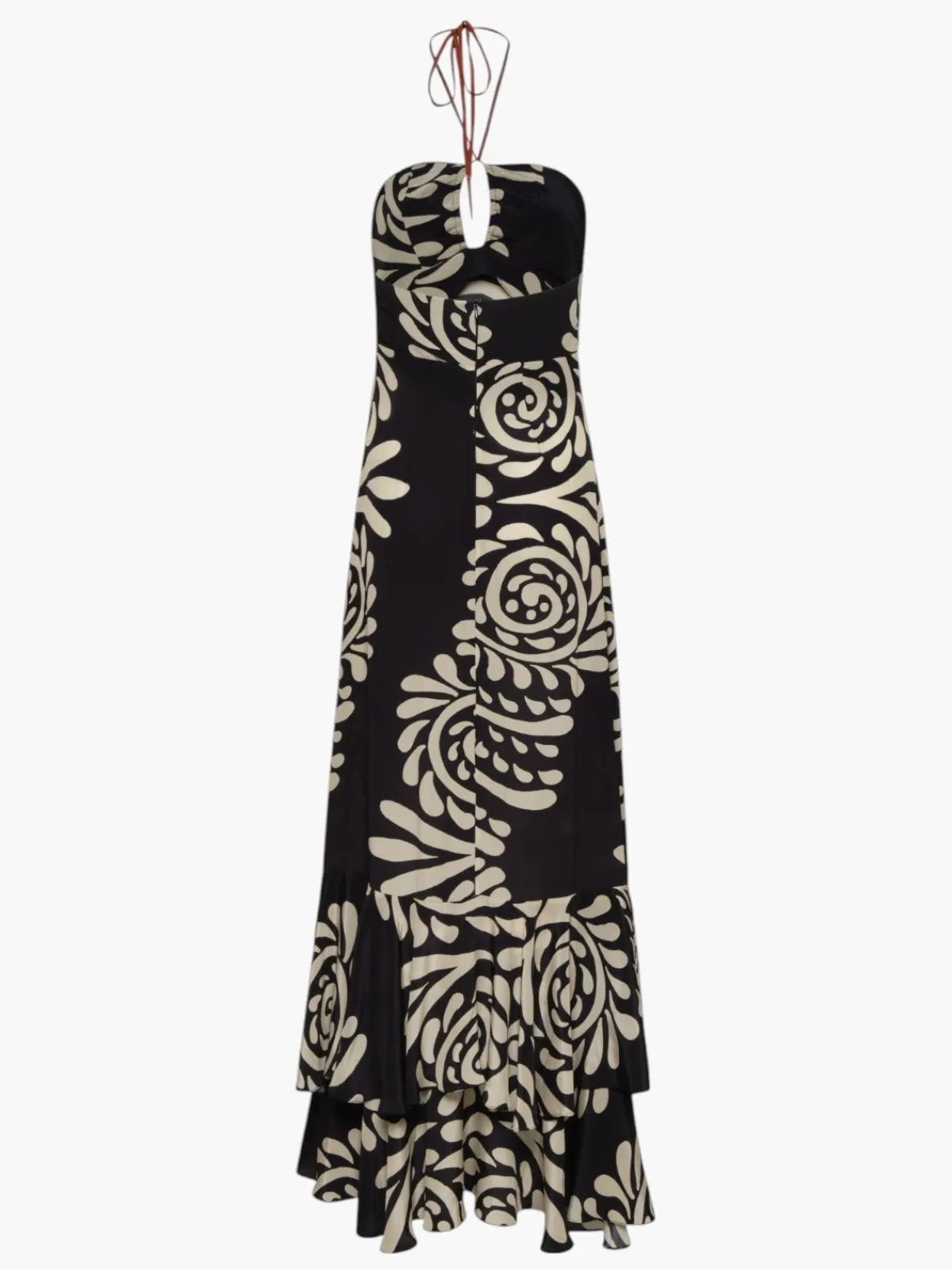Our Juan de Dios Sevillana Crepe Chine Dress in Black Arabesque is a flowing maxi dress featuring an elegant ruffle hem, a halter-style sweetheart neckline, and a delicate keyhole cutout at the front for a touch of allure. Handcrafted by female heads of households in Colombia.