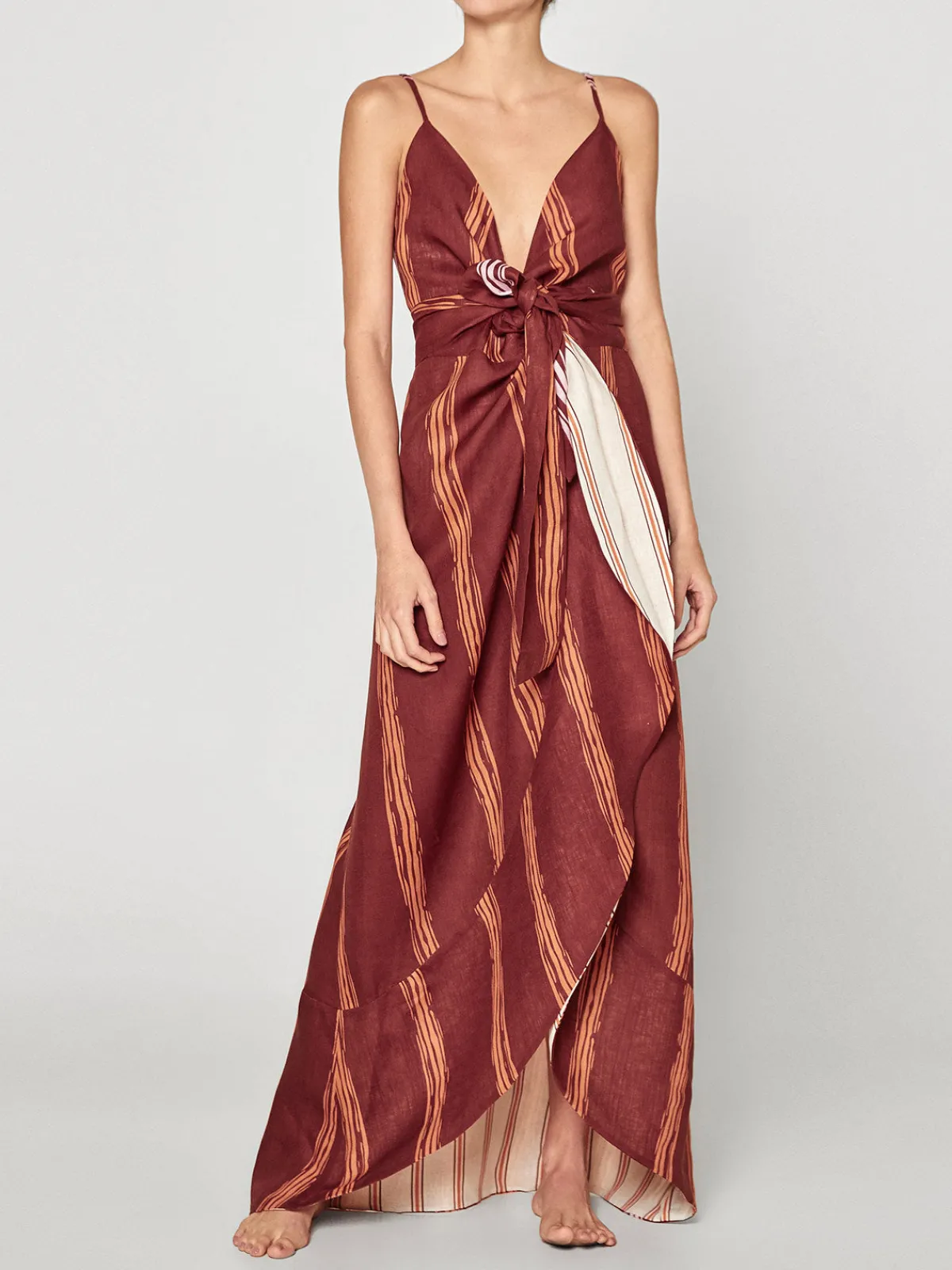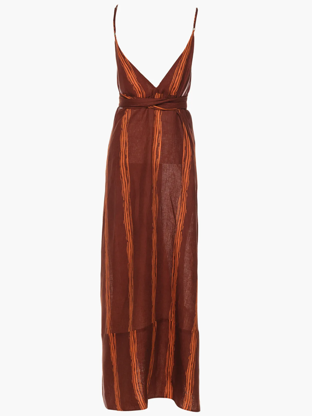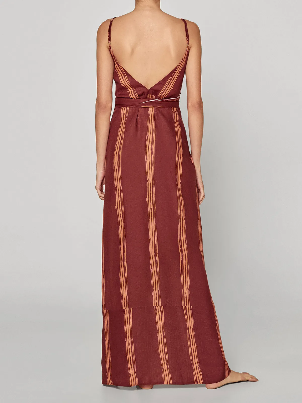 Our Juan de Dios Sophia Linen Dress in Wine Stripes boasts effortless style in a maxi length with an allover print, spaghetti straps, and a V-neckline. It’s detailed with a V-shaped back and a self-fabric belt that can be tied in front or back. Crafted by artisans in Colombia.