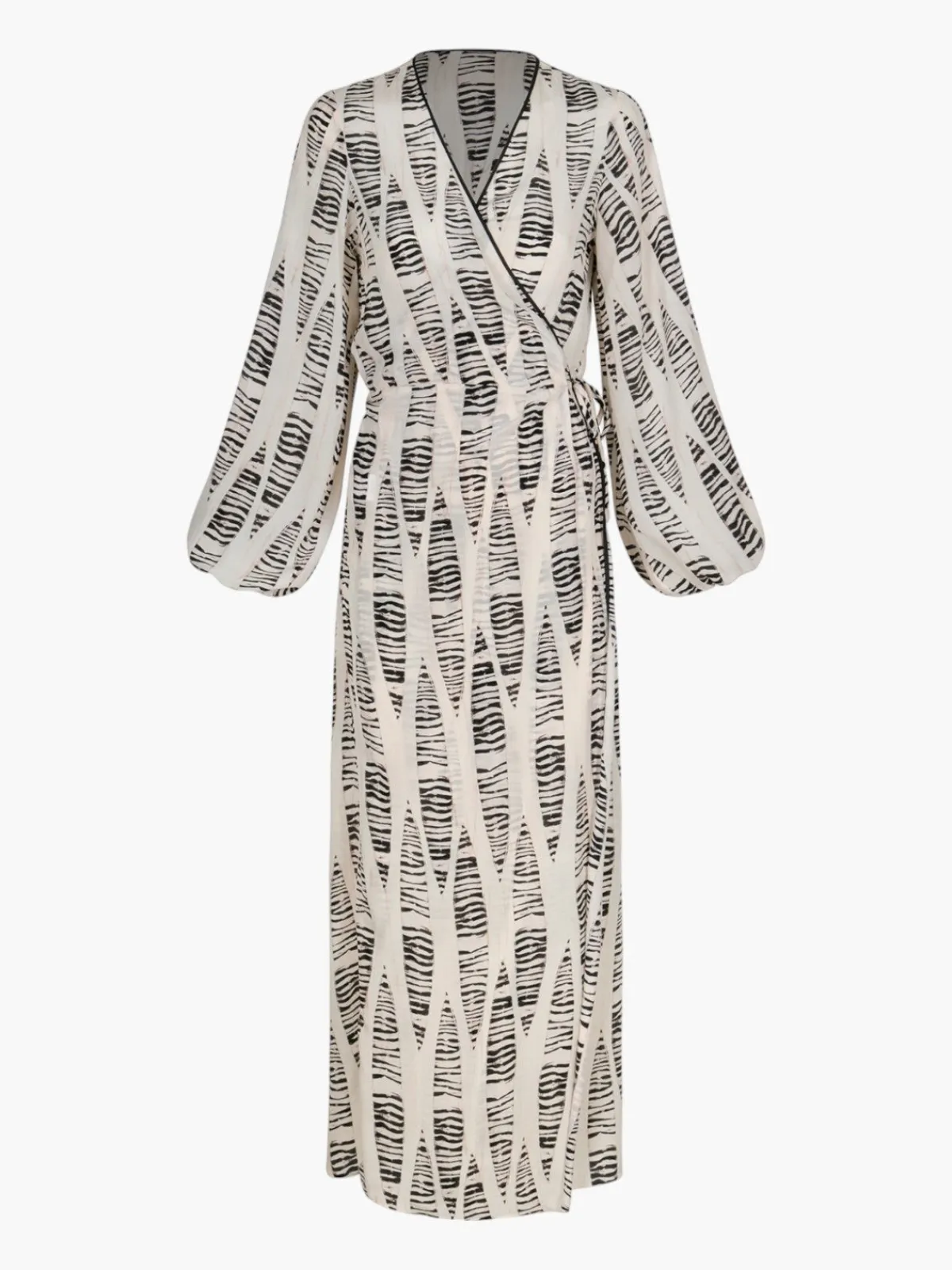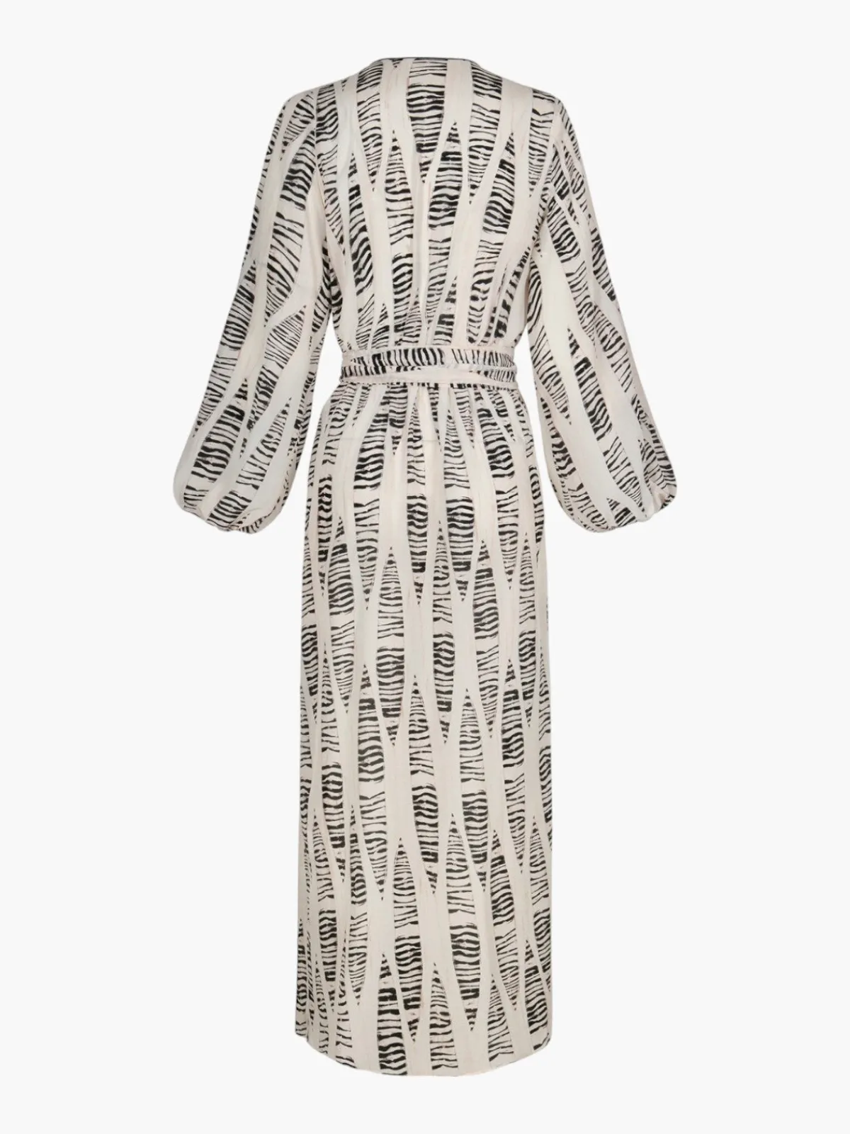 Our Juan de Dios Tertulia Crepe Chine Maxi Dress in Cream Canoe is features a maxi length feminine silhouette with long balloon sleeves and a belted tie for a defined waist. Handcrafted in Colombia by female heads of households.