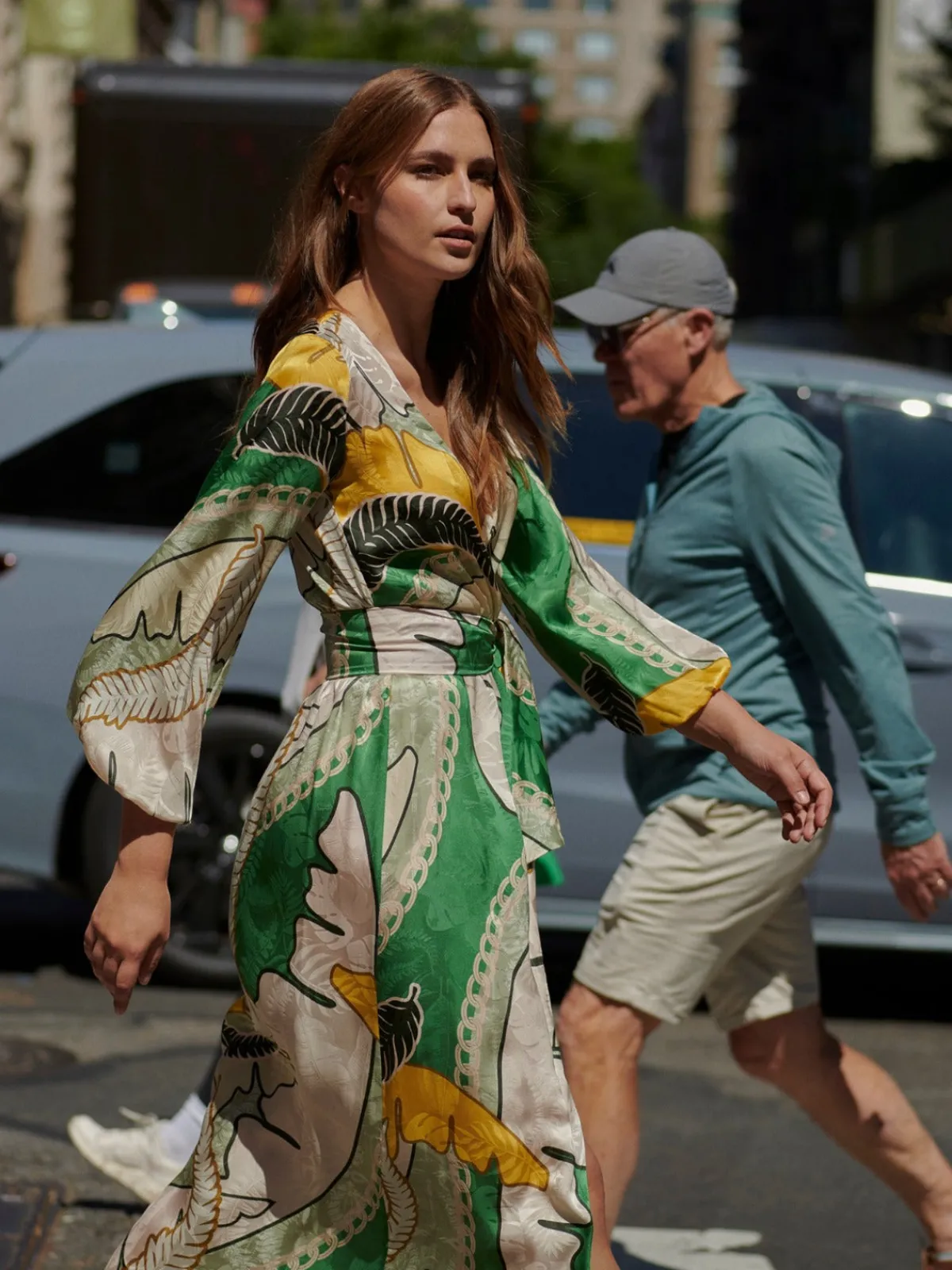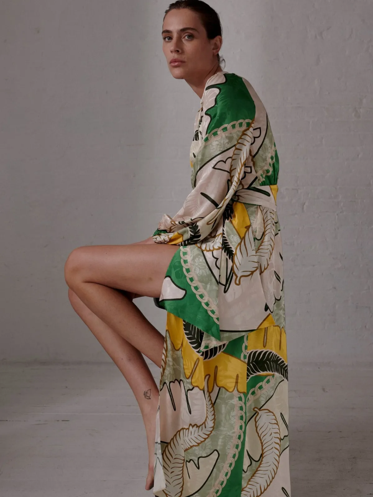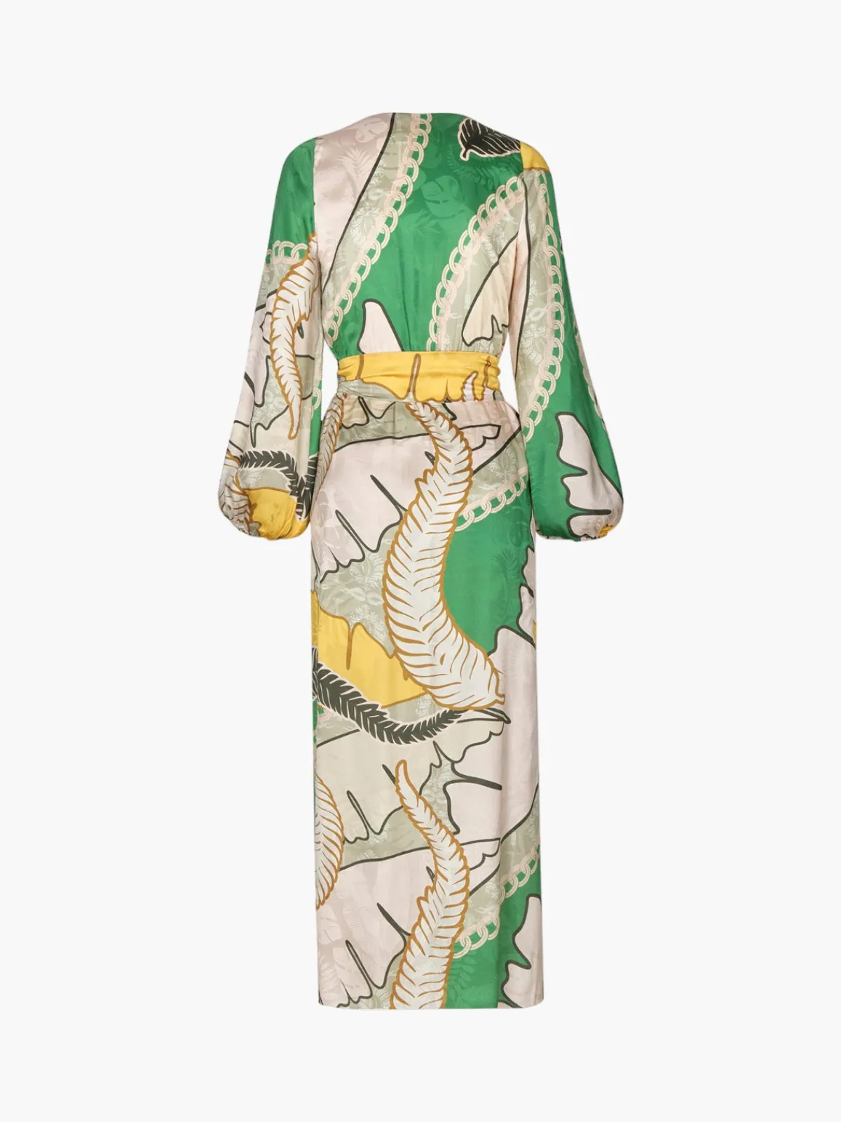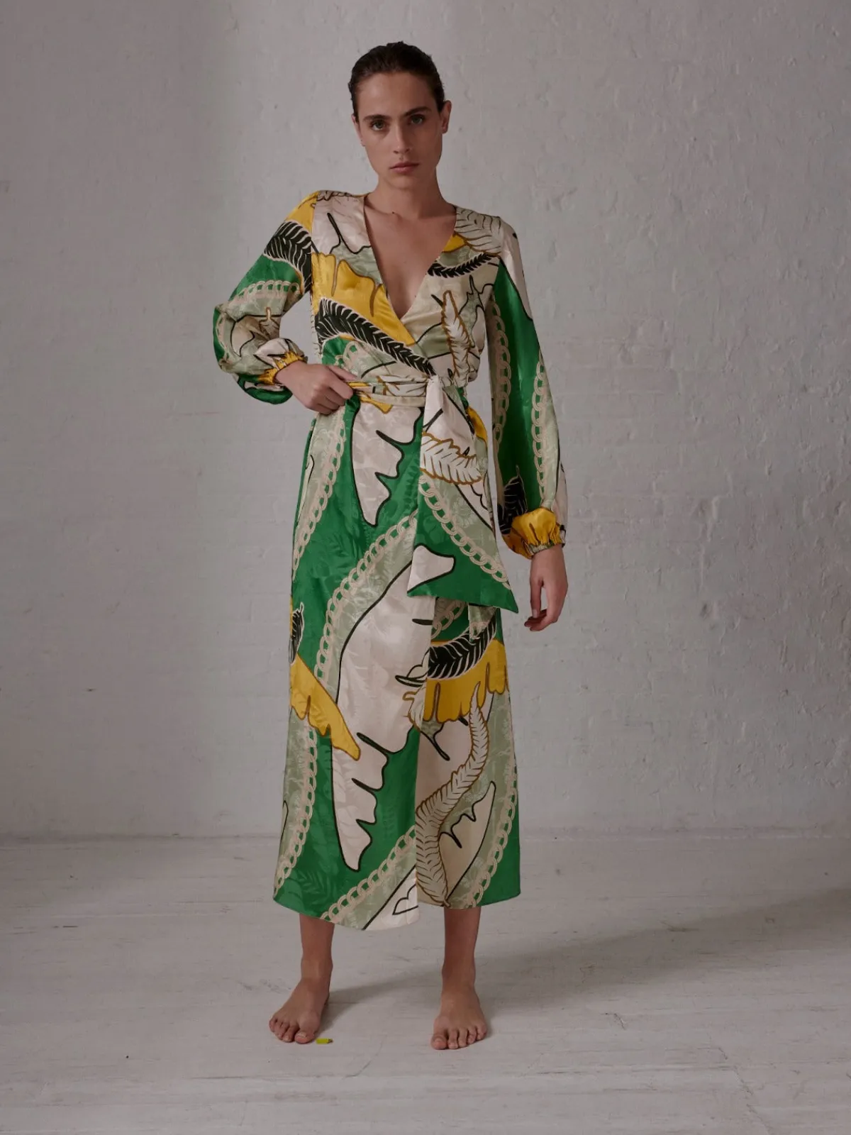 u0026quot;}”>Our Juan de DiosTertulia Maxi Dress in Green is a feminine silhouette tailored in 100% silk. Featuring this season’s show-stopping Green Cream Palm Leafs print, long balloon sleeves and belt ties for a defined waist.Handcrafted in Colombia by female heads of households.