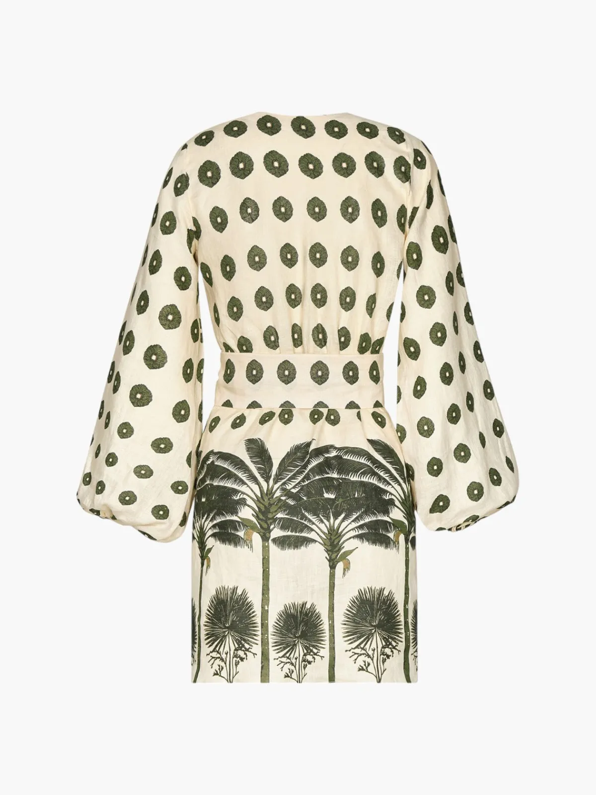 Our Juan de Dios Tertulia Mini Dress in Cream Mini Palms Green is a feminine silhouette tailored in 100% linen. The dress features long balloon sleeves and belt ties for a defined waist, this style is the epitome of sophistication and style. Included belt is detachable. Handcrafted in Colombia by female heads of households.