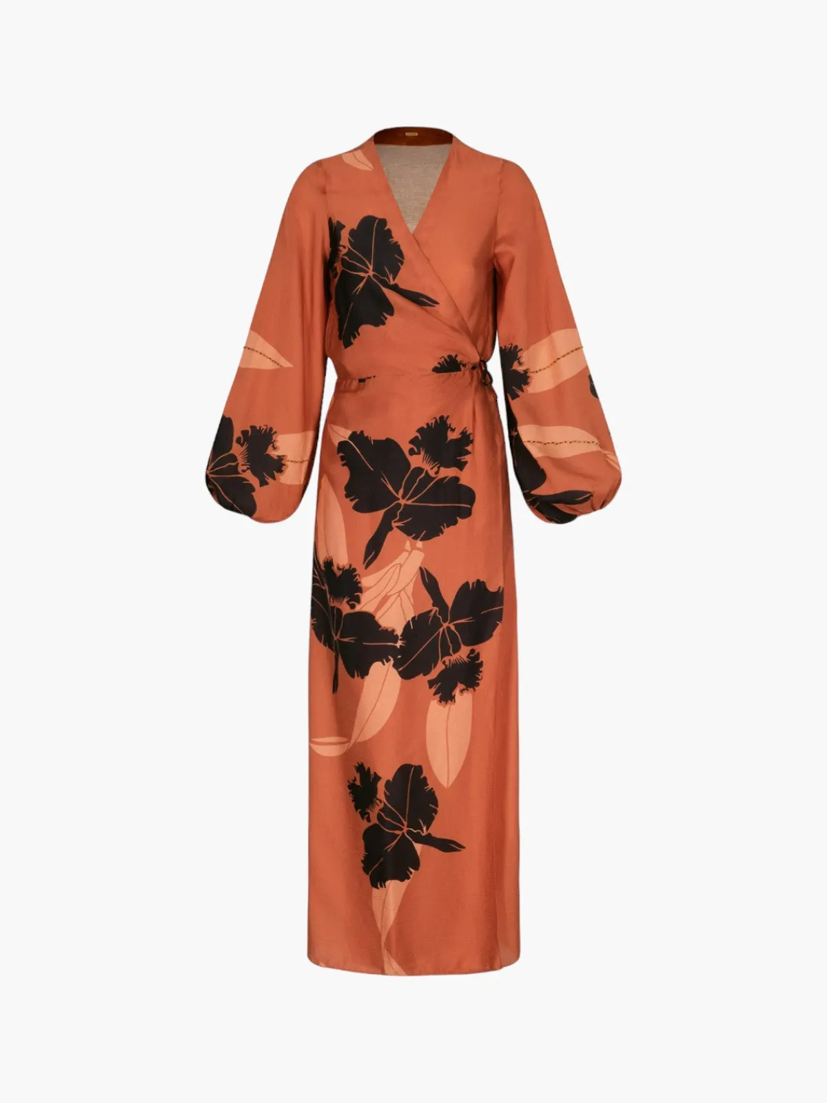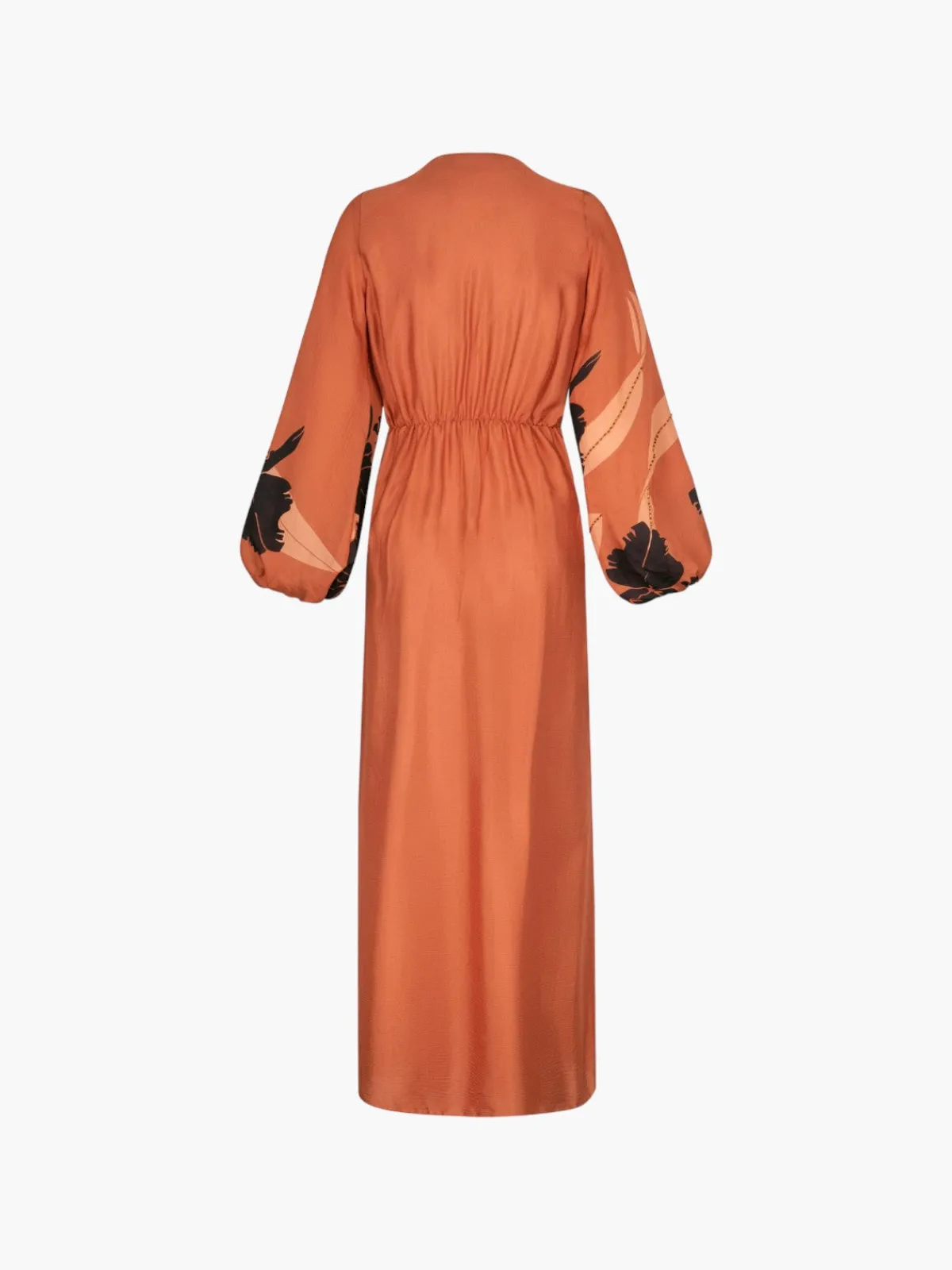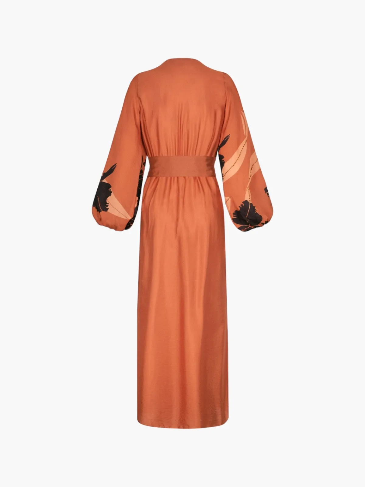 Our Juan de Dios Tertulia Martellato Silk Maxi Dress in Terra Orchideas is a maxi length dress with long balloon sleeves and belt ties at the waist. The dress features a subtle v-neckline and is accented with beaded detailing. Handcrafted in Colombia by female heads of households.