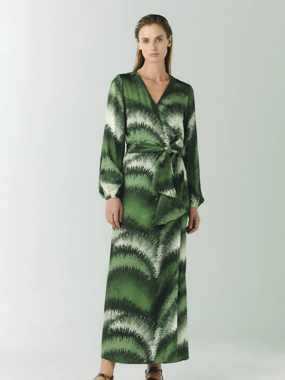 Our Juan de Dios Tertulia Maxi Dress in Green Brushed is a feminine silhouette tailored in 100% silk. This dress has a maxi length featuring long balloon sleeves and belt ties for a defined waist. Handcrafted in Colombia by female heads of households.