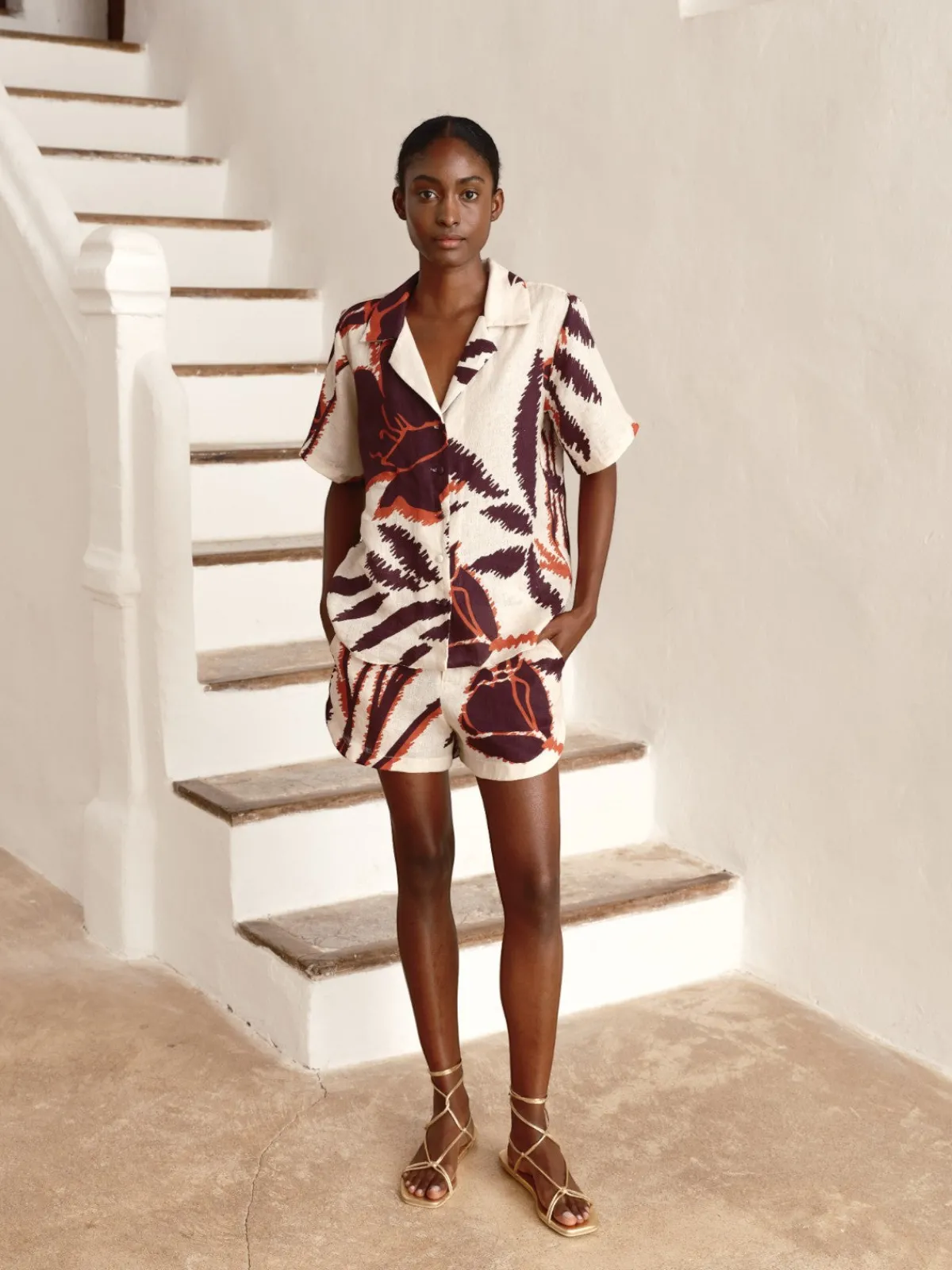 Our Juan de Dios Tomaso Shirt in Ecru/Purple Gladiolos is a short sleeve collared shirt with a front button closure. Handcrafted in Colombia by female heads of households.