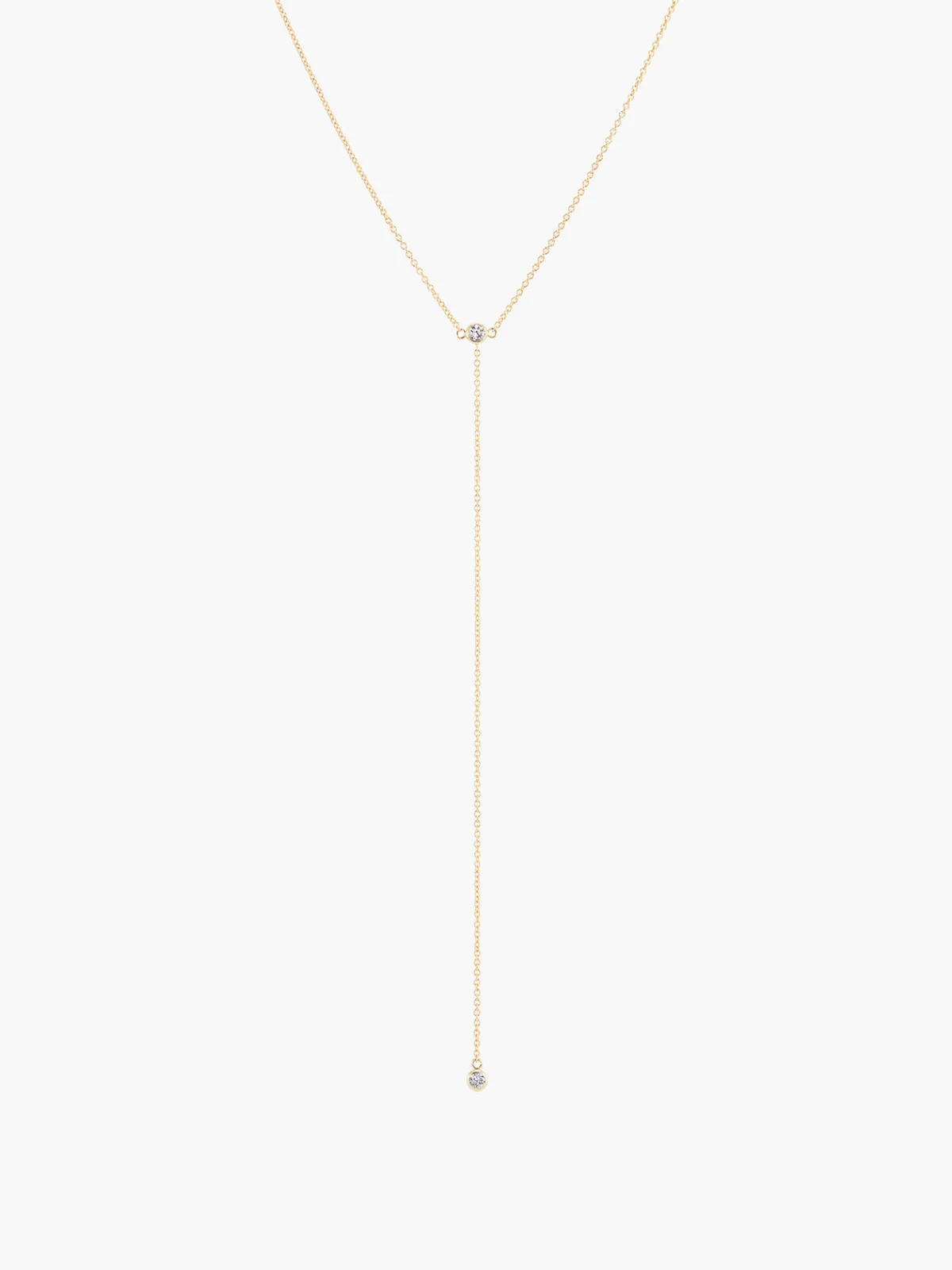 Our KBH Jewels Lariat Split necklace features a delicate chain with a dangling vertical lariat and sparkling diamonds at the drop and connection. Handcrafted by artisans in NYC.