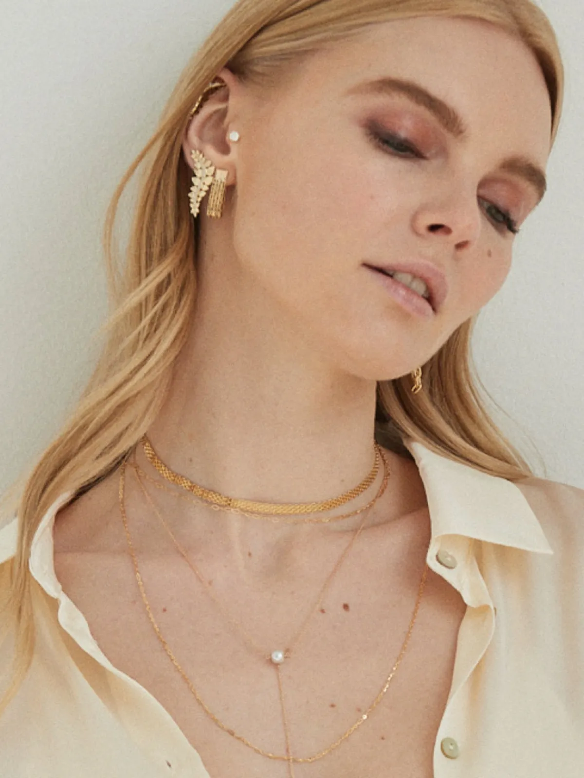 Our KBH Jewels Triple Bismark Loops feature a drop design made from flexible gold mesh with an ear nut bullet back. Handcrafted by artisans in NYC.