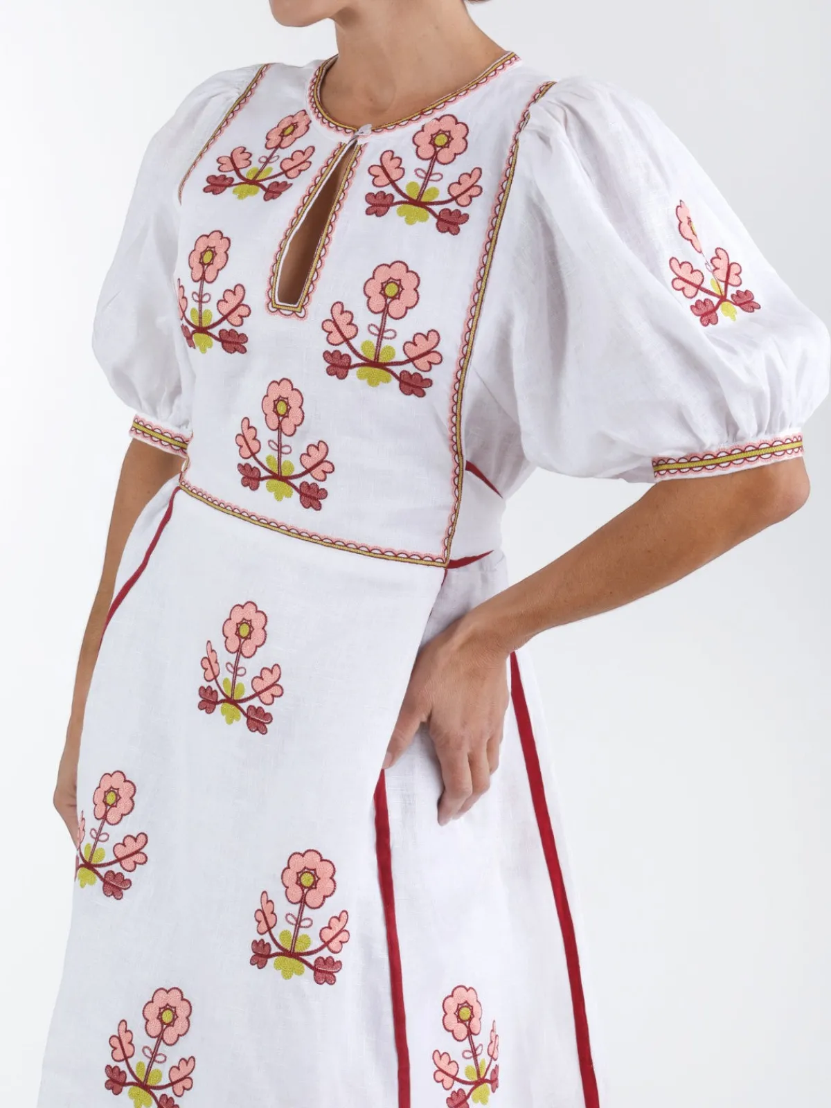 Our Larkin Lane Lillie Ukrainian Embroidered Dress in White/Pink is a maxi length dress that has a fitted bodice that cinches at the waist and can be tied in the front or back. The skirt is two-tiered that drapes gracefully with side pockets. This dress has embroidery details that are done by hand throughout the front and back. This is a pull on style with no zippers. Handcrafted by a community of artisans in Kiev, Ukraine, the majority of whom are women, who practice traditional local techniques that date back to the fifth century.
