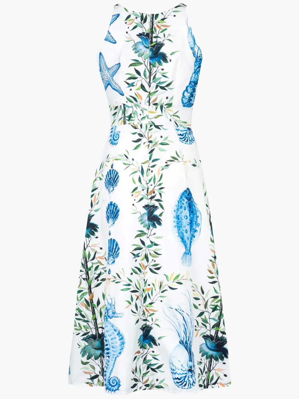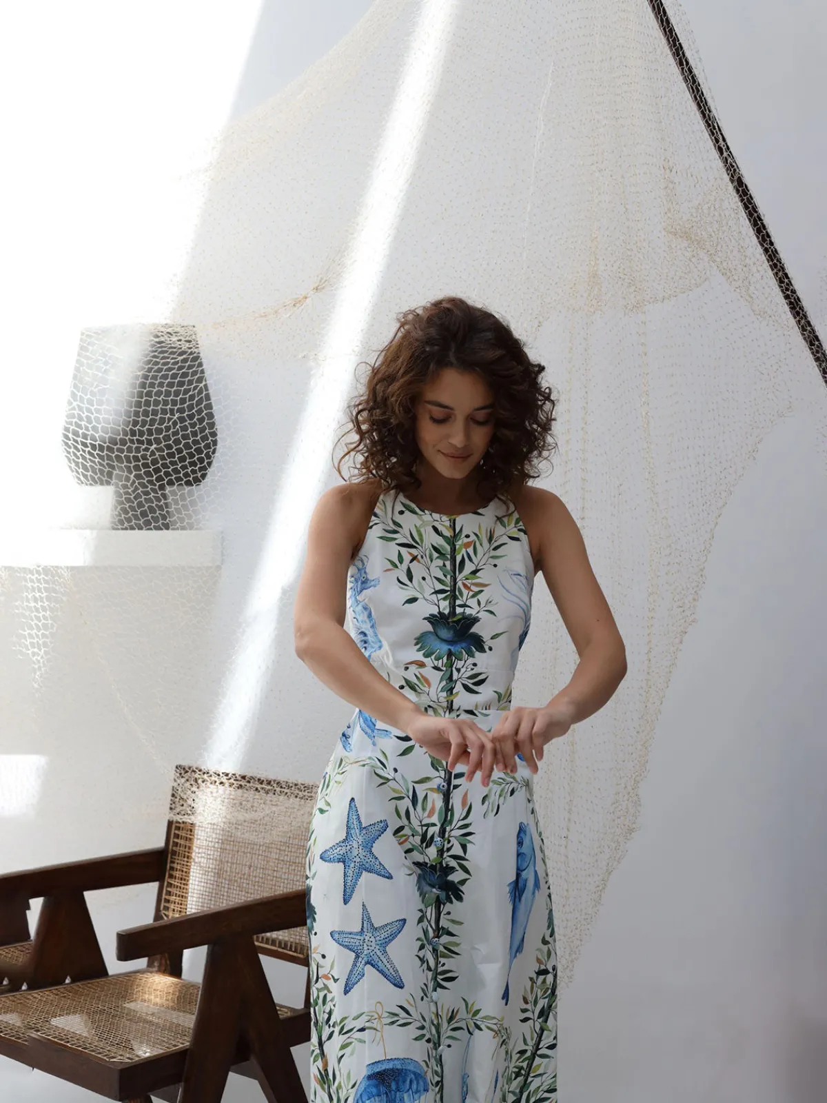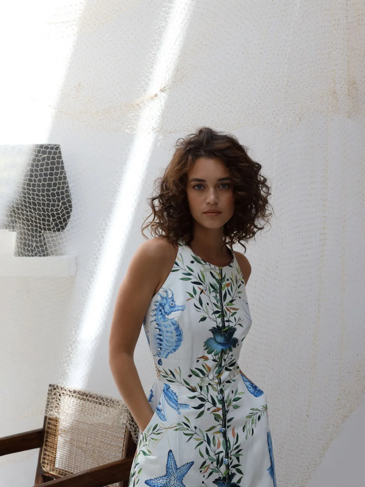 Our Maison Alma Dress in Vida Marina features a sleeveless silhouette with a fitted bodice, a round neckline, and an A-line skirt. Detailed with a back zipper, front pockets, this midi dress is entirely handcrafted by master tailors in Colombia.