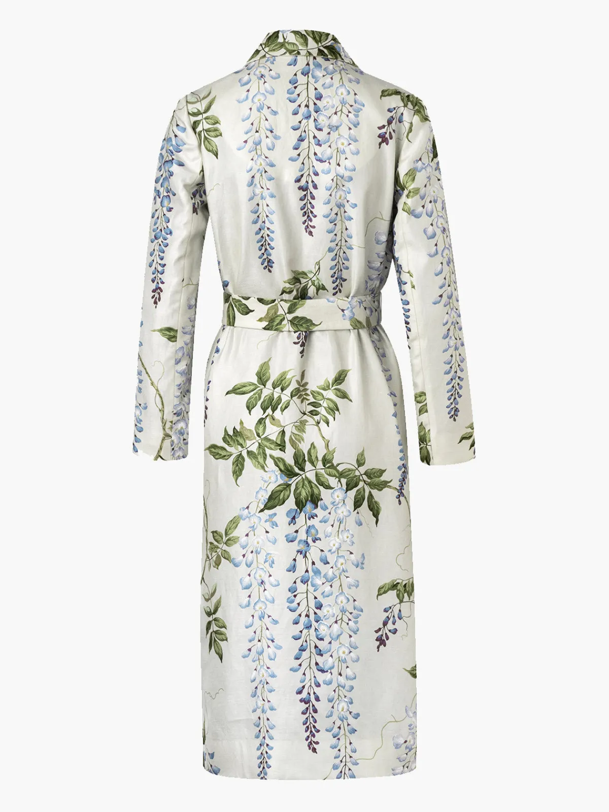 Our Maison Alma Blue Wisteria Kimono boasts elegance and sophistication in a long sleeve silhouette with removable wrap belt, a notch collar, and narrow lapels. Detailed with side pockets and a hidden breast pocket, this piece is entirely handmade by master tailors in Colombia.